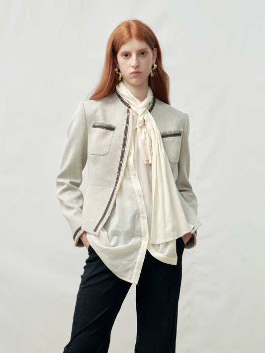 Tassel-Trim Color-Blocked Stand Collar Waist-Cinched Blazer Jacket