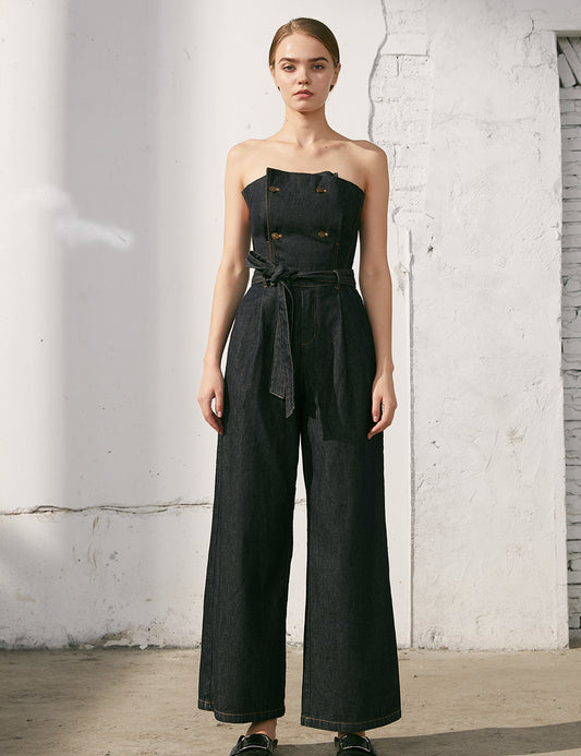 The bold tube top jumpsuit design combines the dress with denim wide-leg pants to bring...