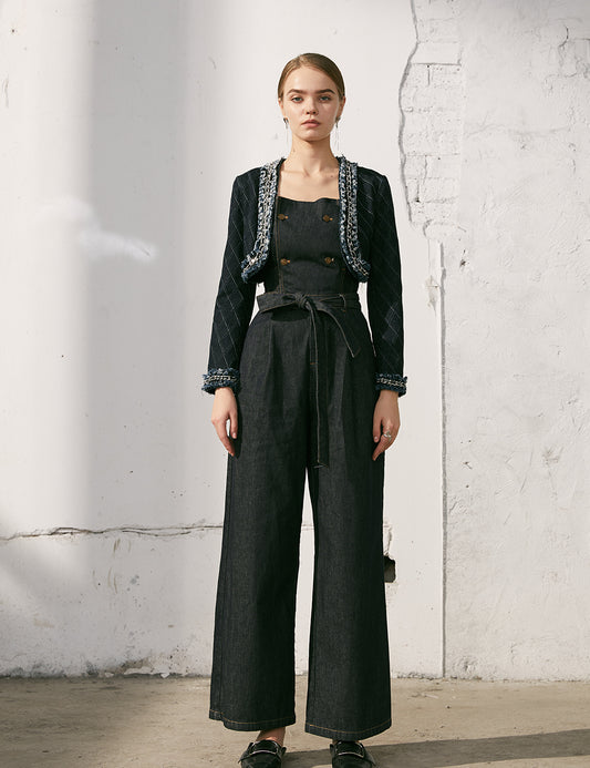 The short wide-shoulder denim jacket is made of diamond check denim fabric, with a hole...