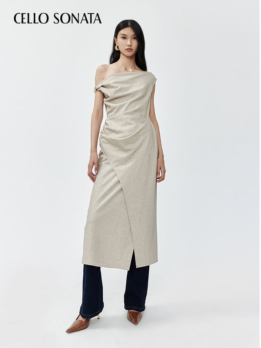 Asymmetrical twist shoulder strap design with metal clasp design attract attention. Waist full skirt version...