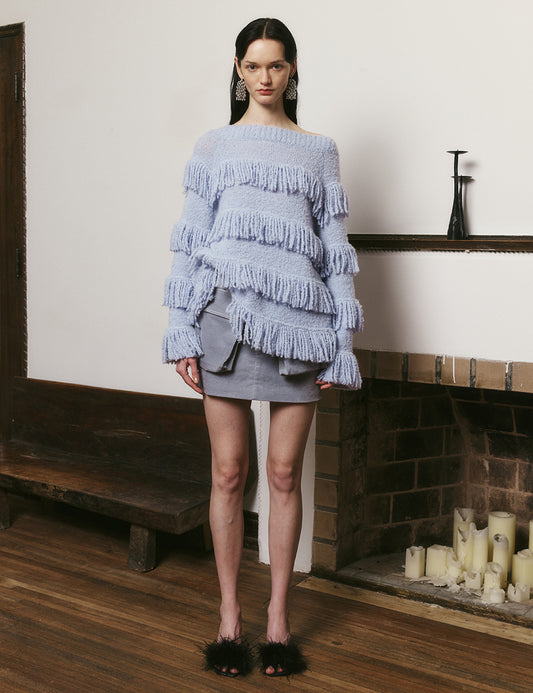 Beige and sky blue wide collar tassel loose alpaca wool sweater