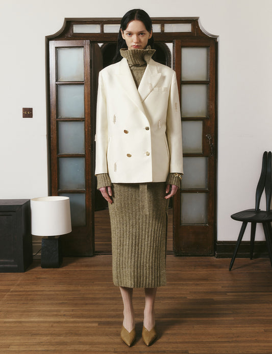 This suit is made of acetate fabric that feels sturdy and textured. The cropped silhouette...