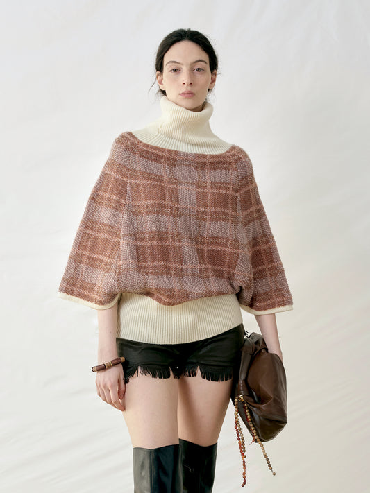 Plaid Turtleneck Cape Sweater