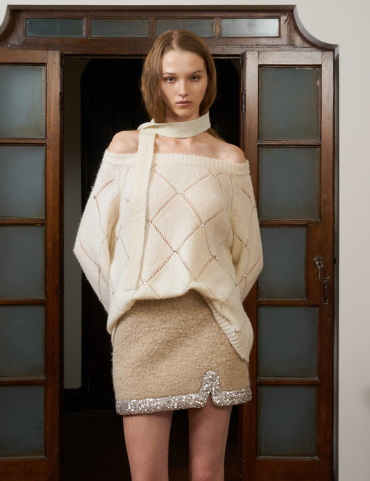 Yellow and off-white diamond-set hollow knitted ribbon one-shoulder top