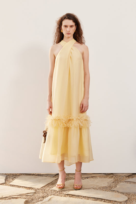 Yellow and white halter neck organza tassel hem A-line dress