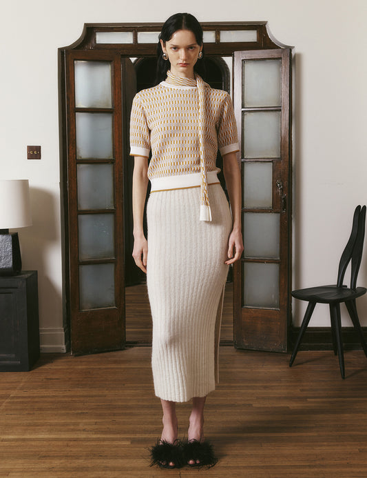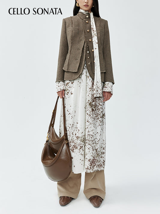 Cross-designed collar highlights the curve of the female neck, light camel hair embellishment to the...