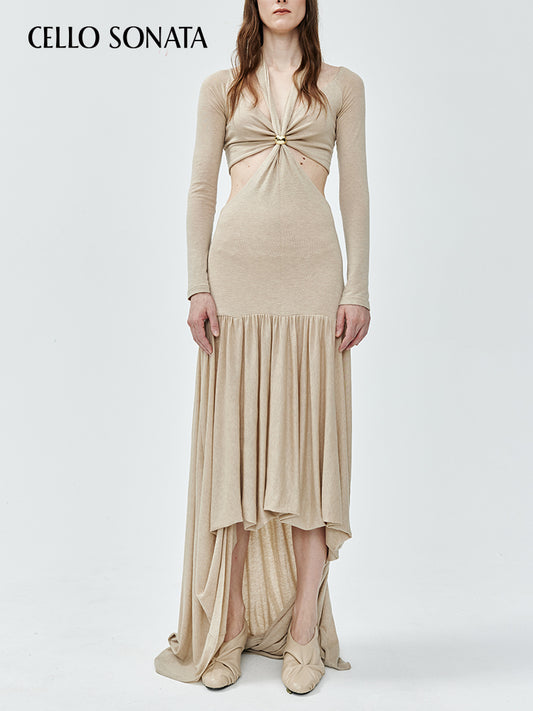 Long Knitted Dress with Hollow Waist and Metal Twisted Knot