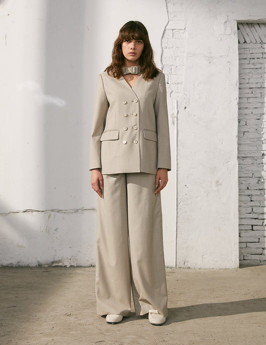 The three-dimensional pleated chain trousers are made of dark gray 100% worsted wool fabric. The...