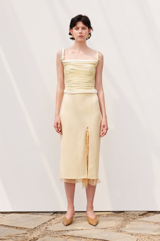 Yellow and white halter neck organza tassel hem A-line dress