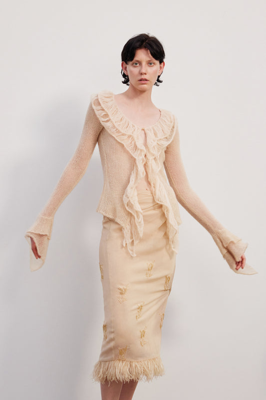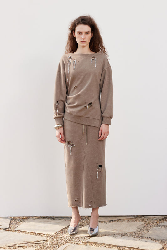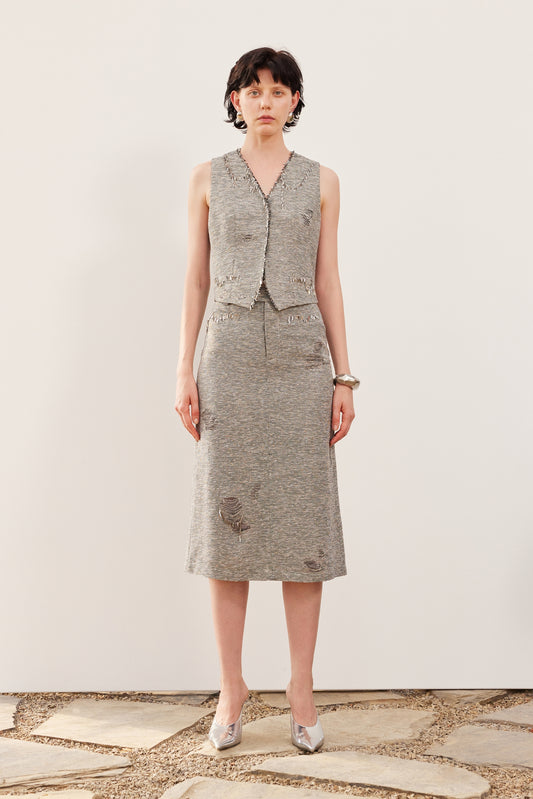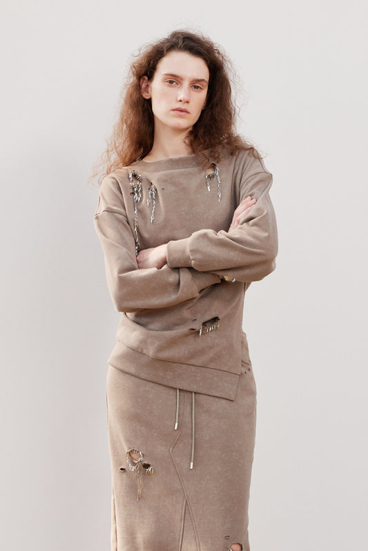 Product Description:Metal fiber blended fabric, hand-worn, with irregular hand-sewn metal chain decoration, creates a variety...