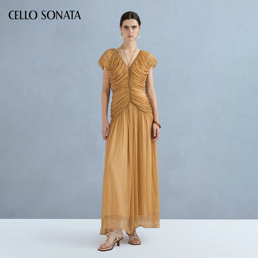 Deep V and soft pleats enhance the neckline, while cut-out waist detailing highlights a confident,...