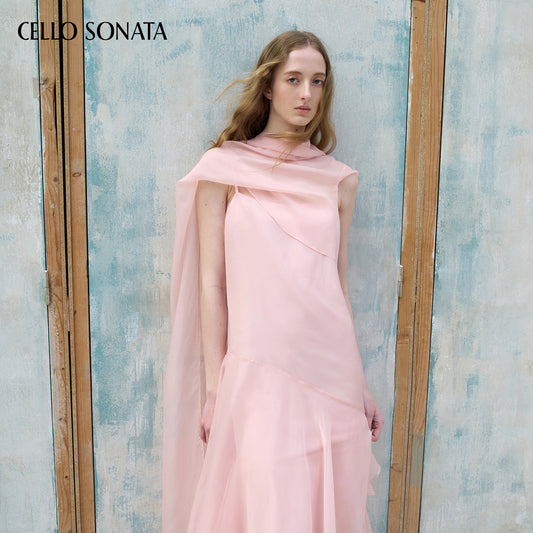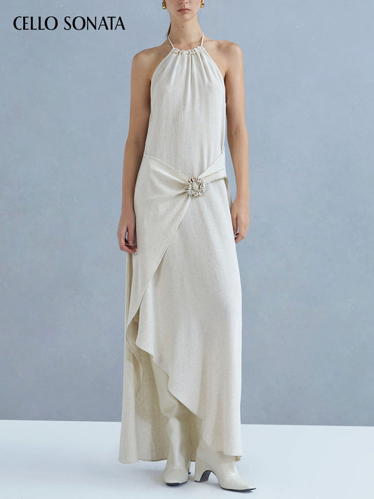 Smooth tailoring with halter neck and waist cut-outs sculpts the silhouette, finished with a flowing...
