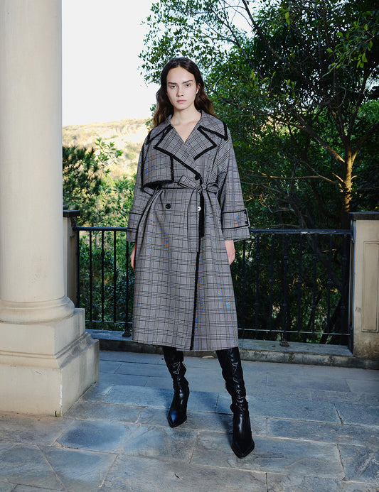 Loose cape trench coat with classic black and white plaid. The product combines the design...
