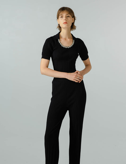 Simple knitted polo top, the product retains the basic simple shape, fused with small diamond...