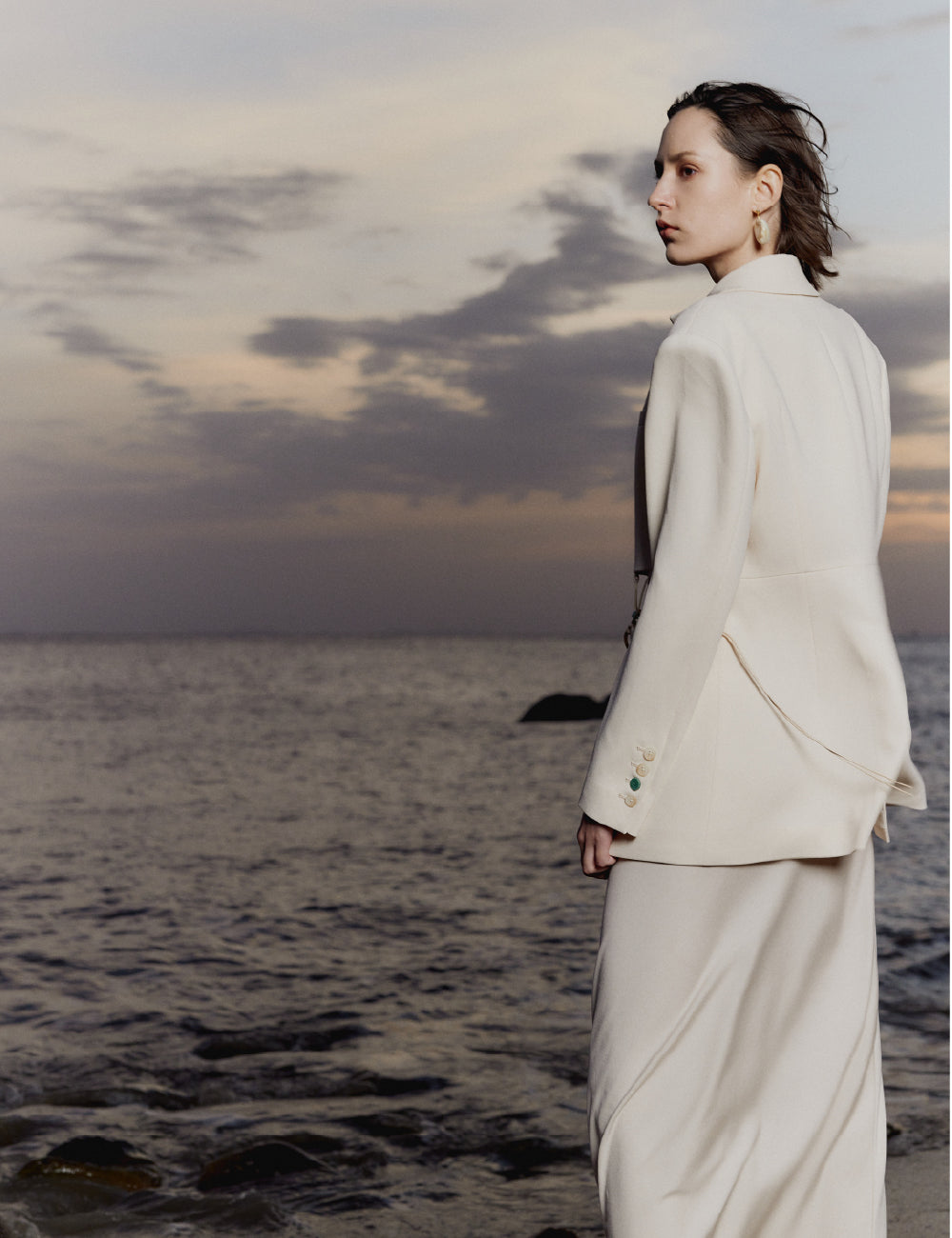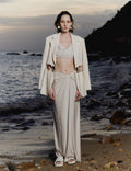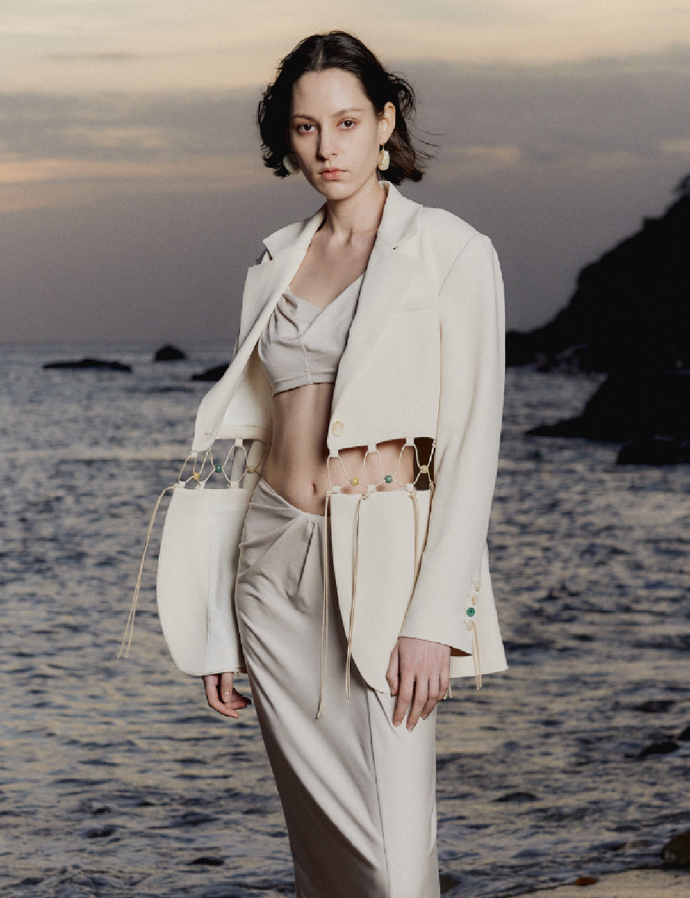 This suit features a refined acetate twill fabric that creates a sharp silhouette. The waist has hollow-out sections and natural contrasting bead decorations, adding a touch of elegance and personality.