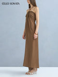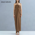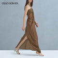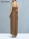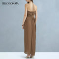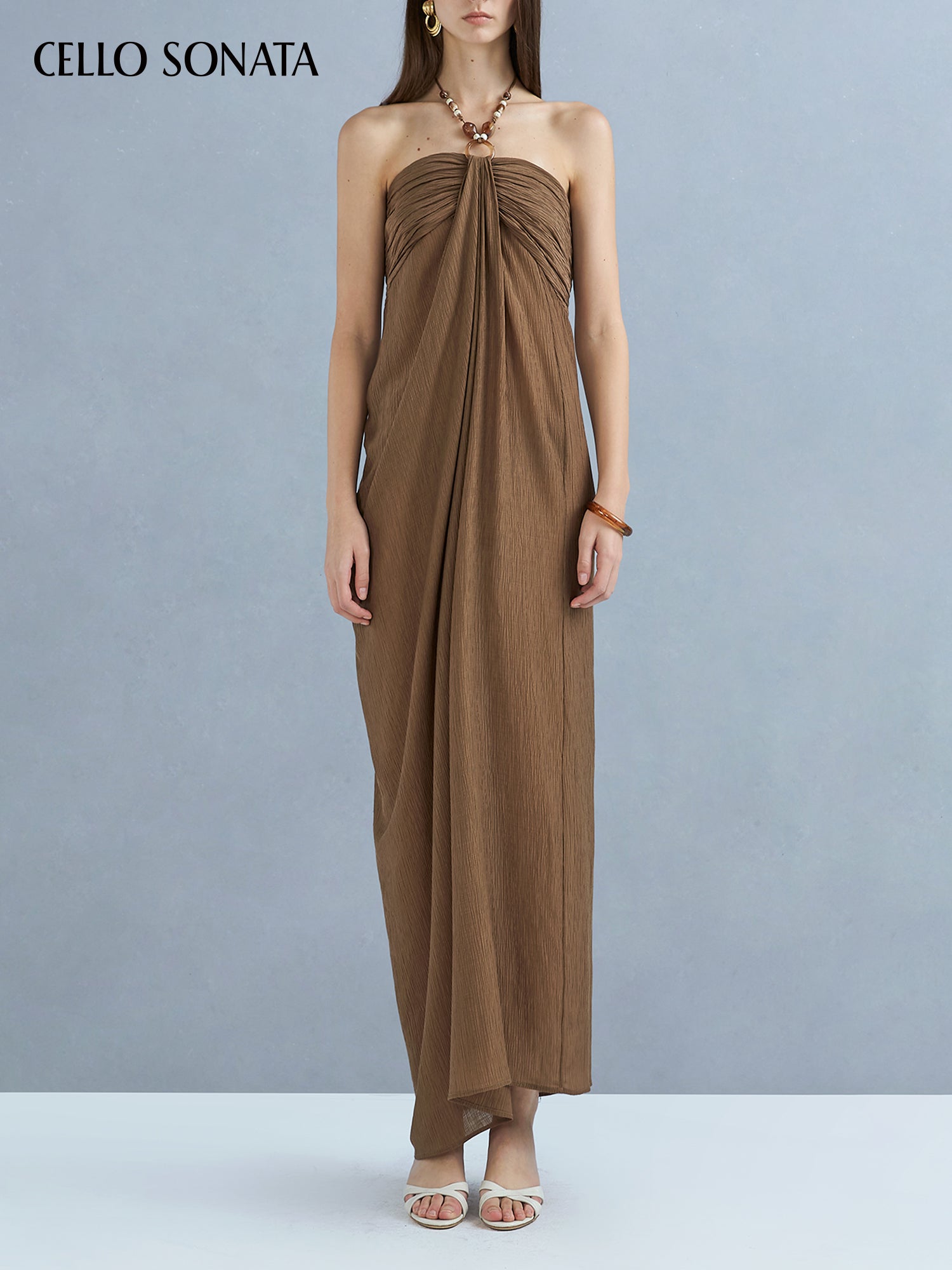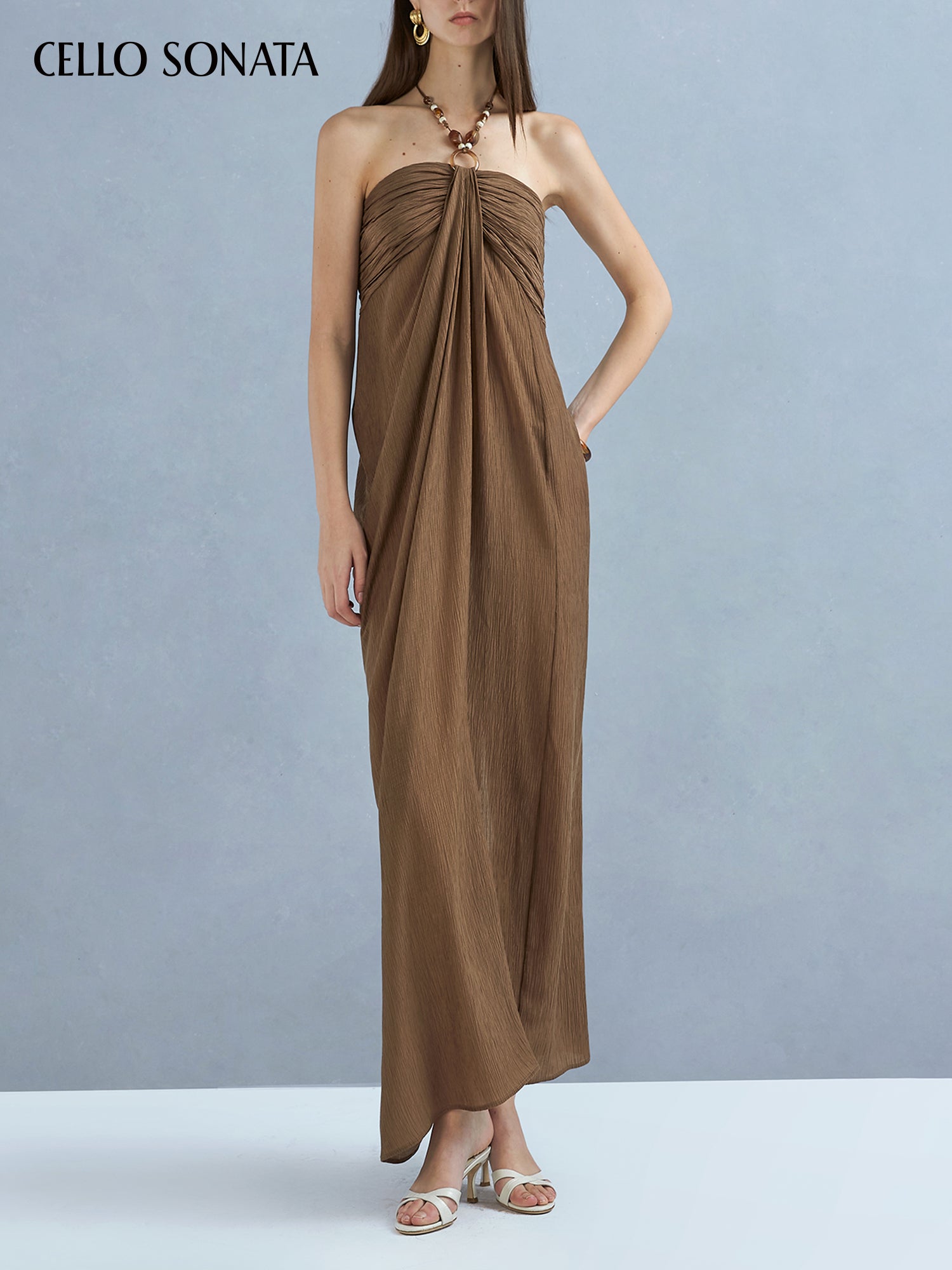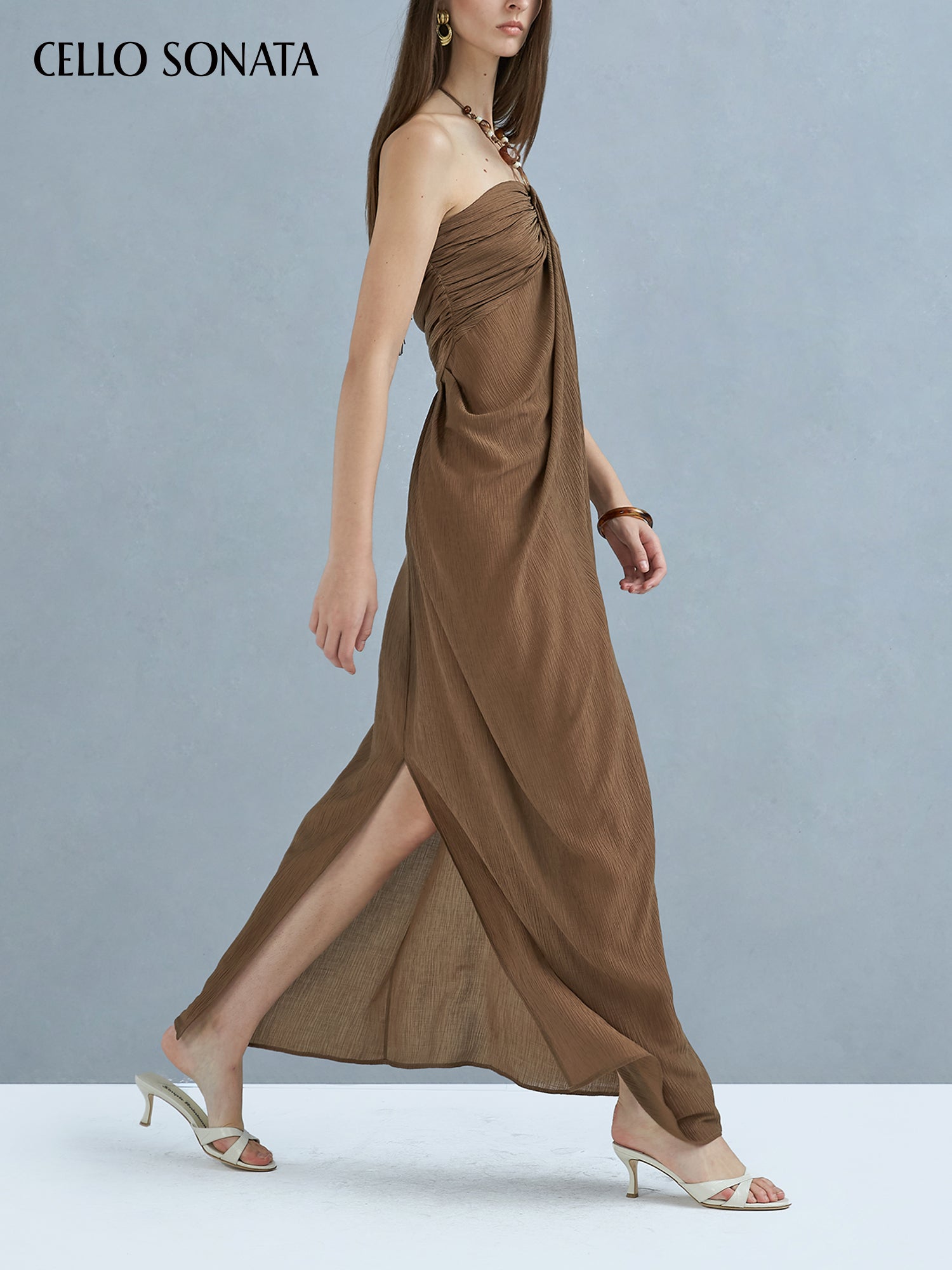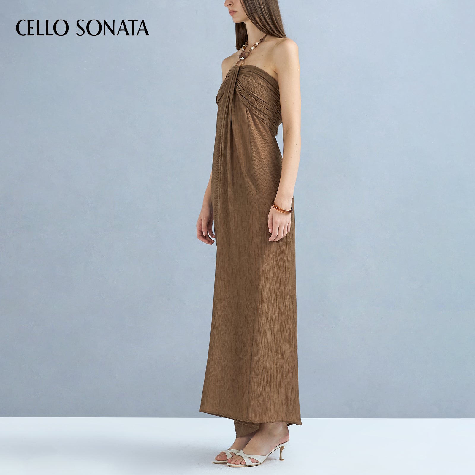 Sculpted tailoring meets elegant draping, with a halter neckline that flatters the shoulders. Beaded accents add a refined, feminine touch.