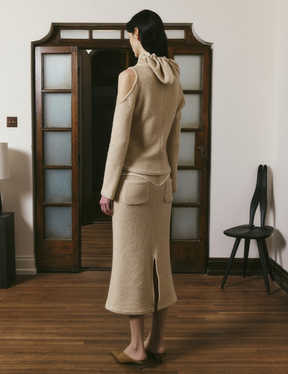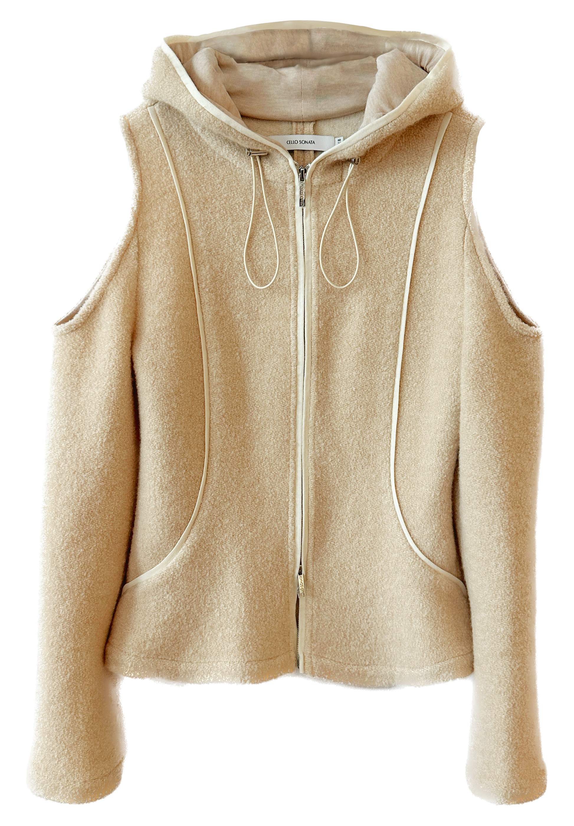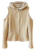 Product Description: The zippered hoodie is made of soft cashmere material, with contrasting edges to add a fashionable style. The hollowed out shoulder design showcases a casual charm.