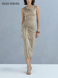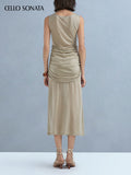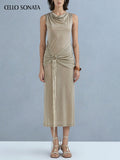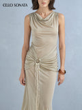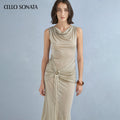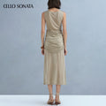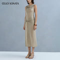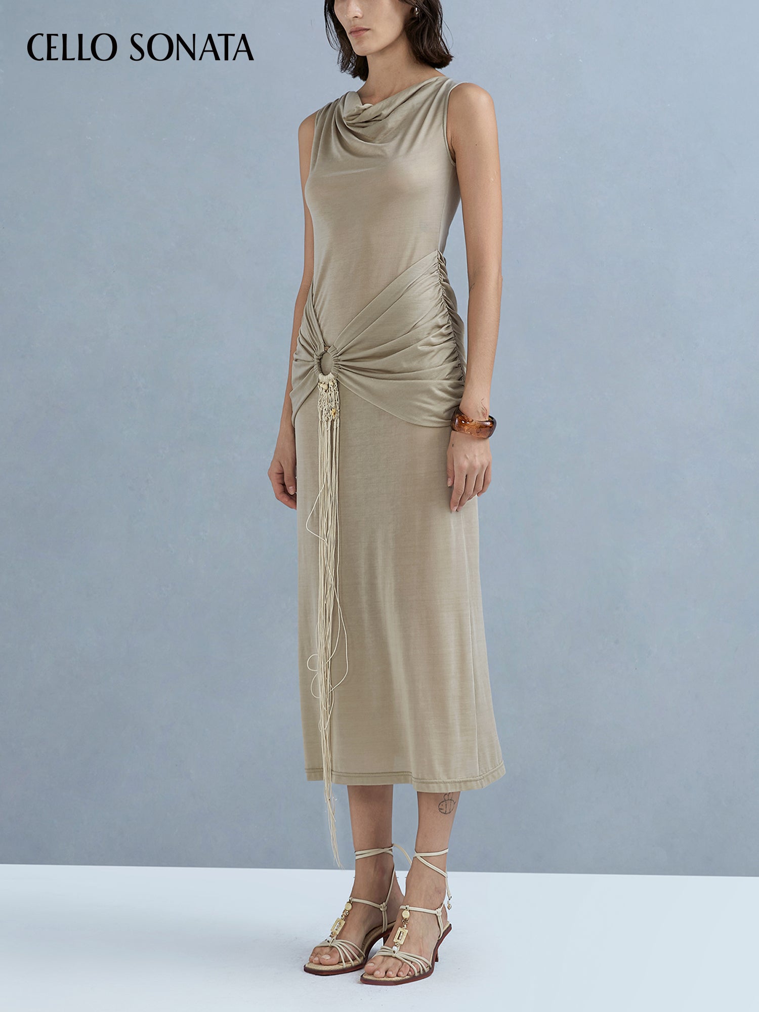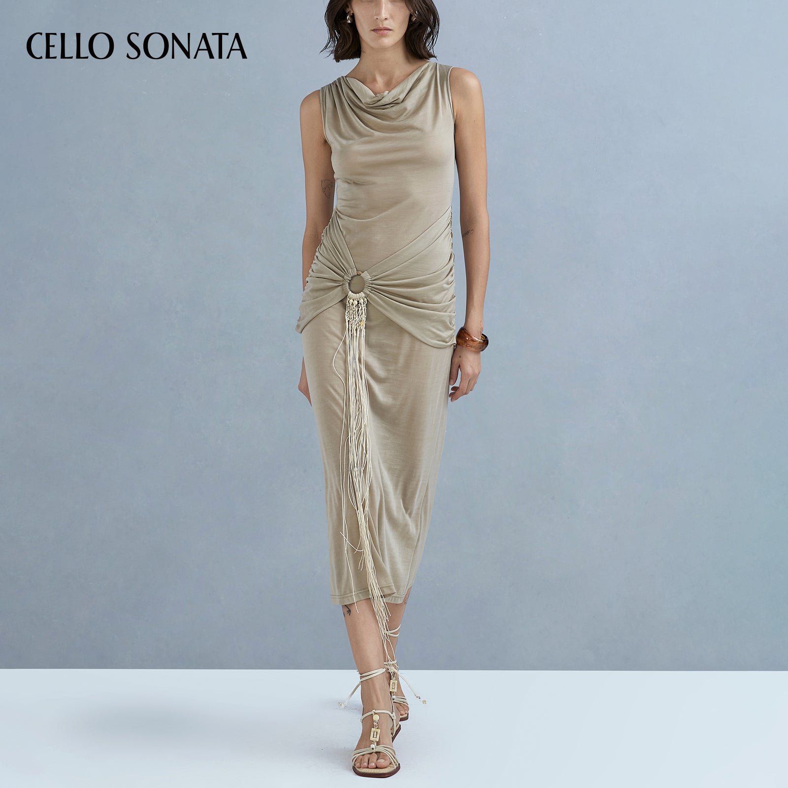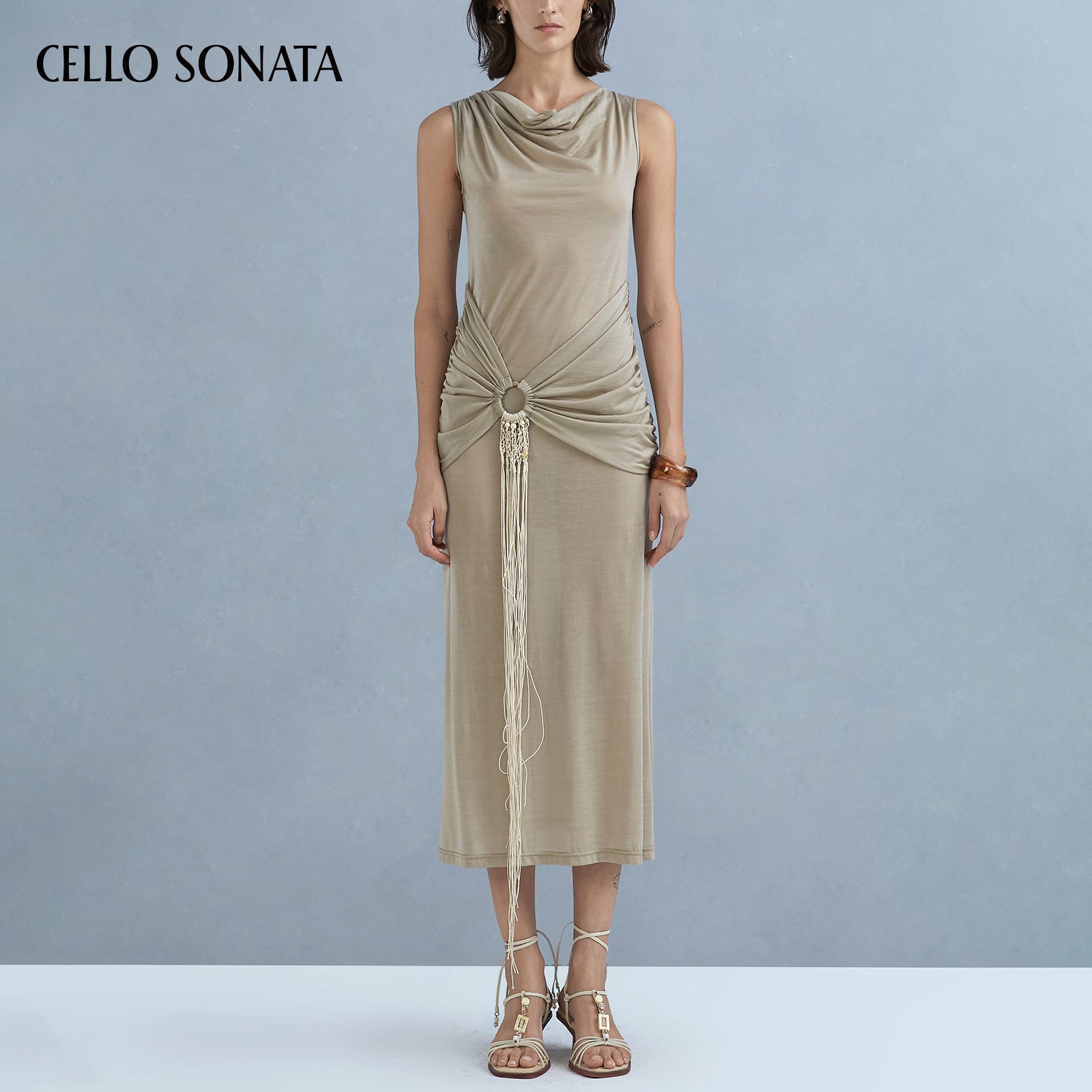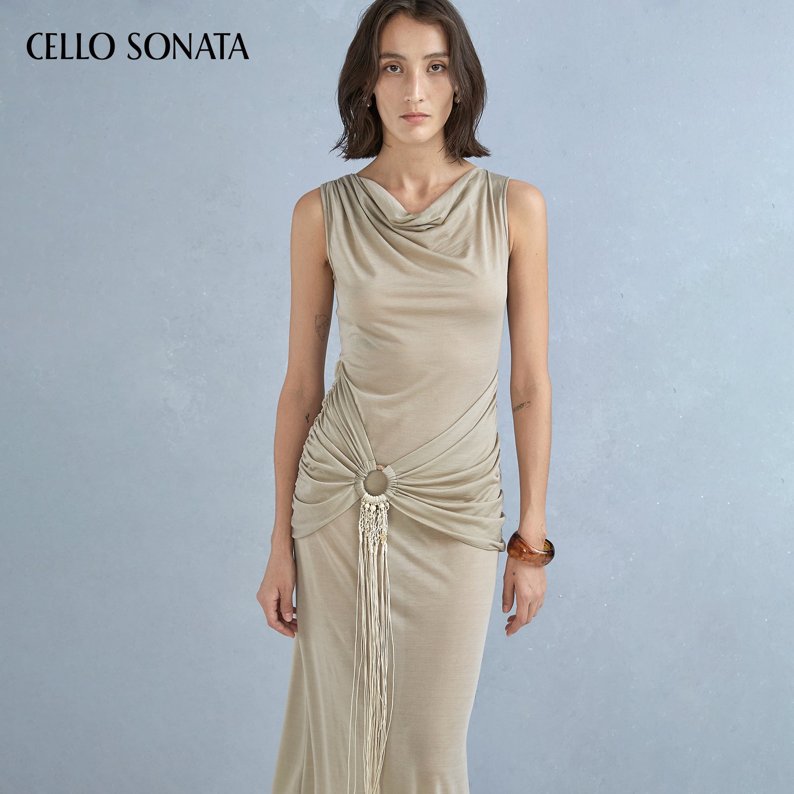 A sculpted collar brings quiet elegance, while coconut buttons and tassels add a playful touch. The sleeveless cut subtly flatters the upper silhouette.