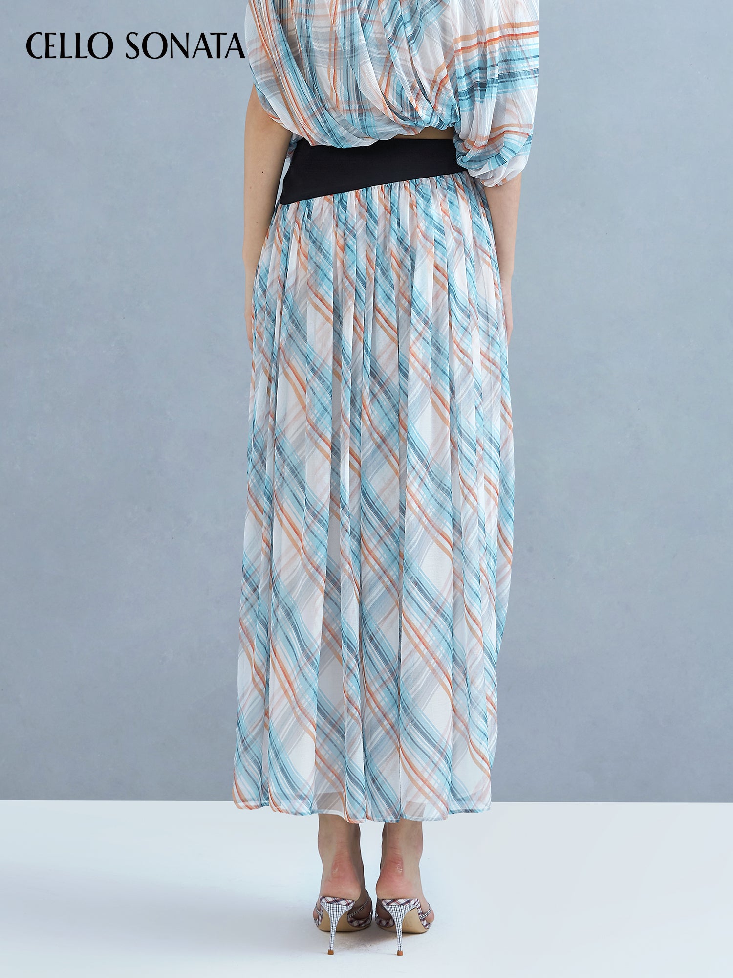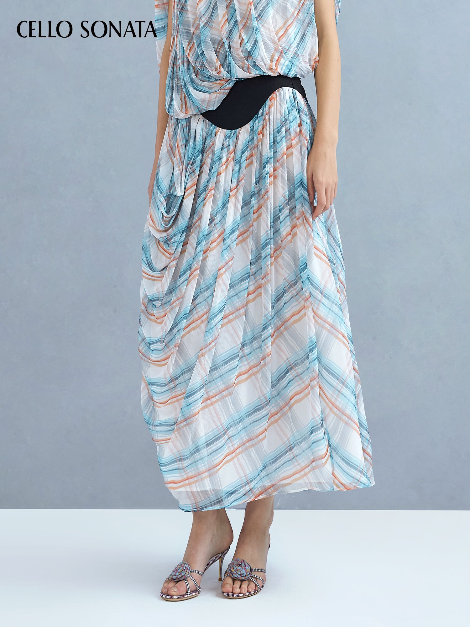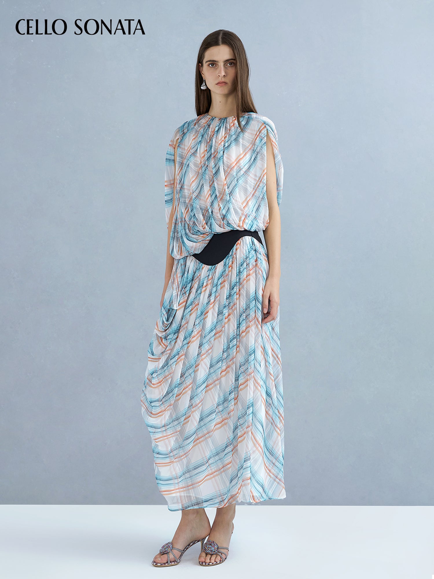 Bold black plaid contrasts with a slimming waist design that celebrates feminine curves. Naturally draped folds add a touch of effortless elegance.
