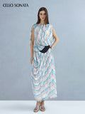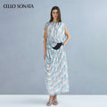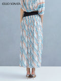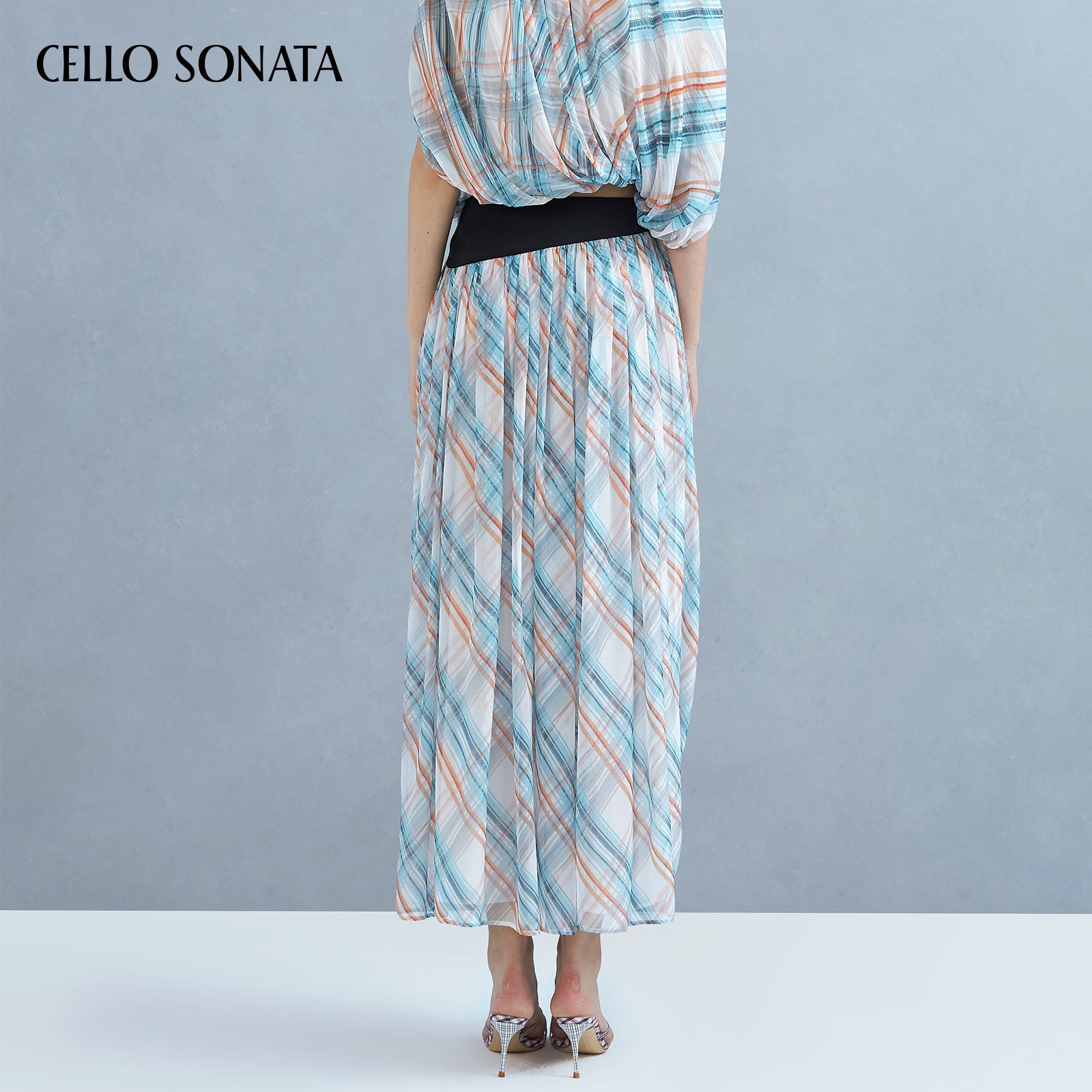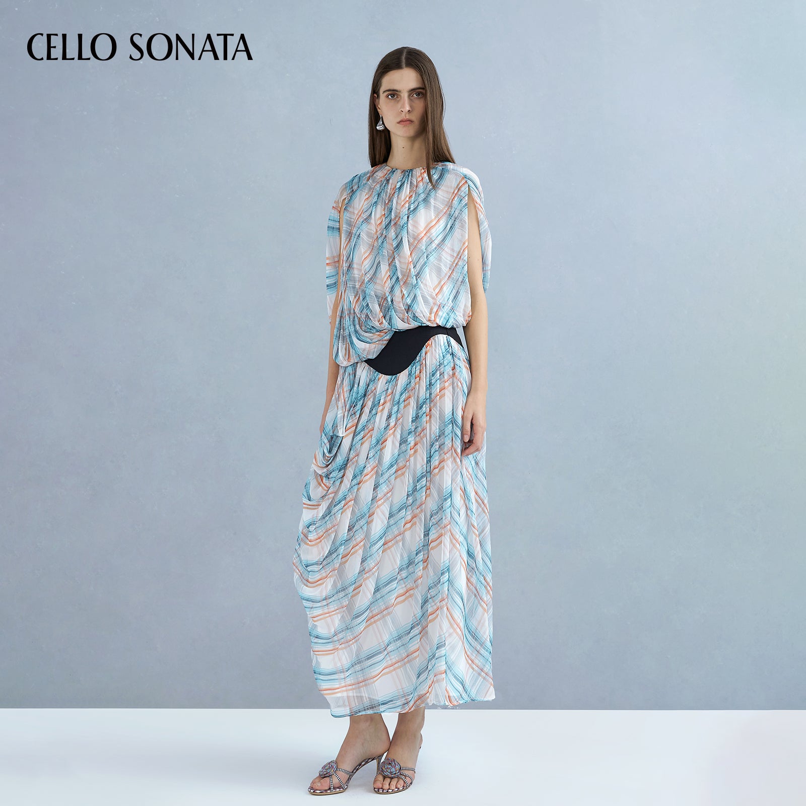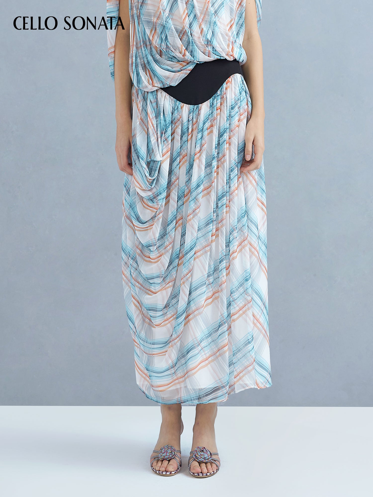 Bold black plaid contrasts with a slimming waist design that celebrates feminine curves. Naturally draped folds add a touch of effortless elegance.
