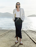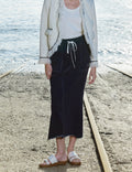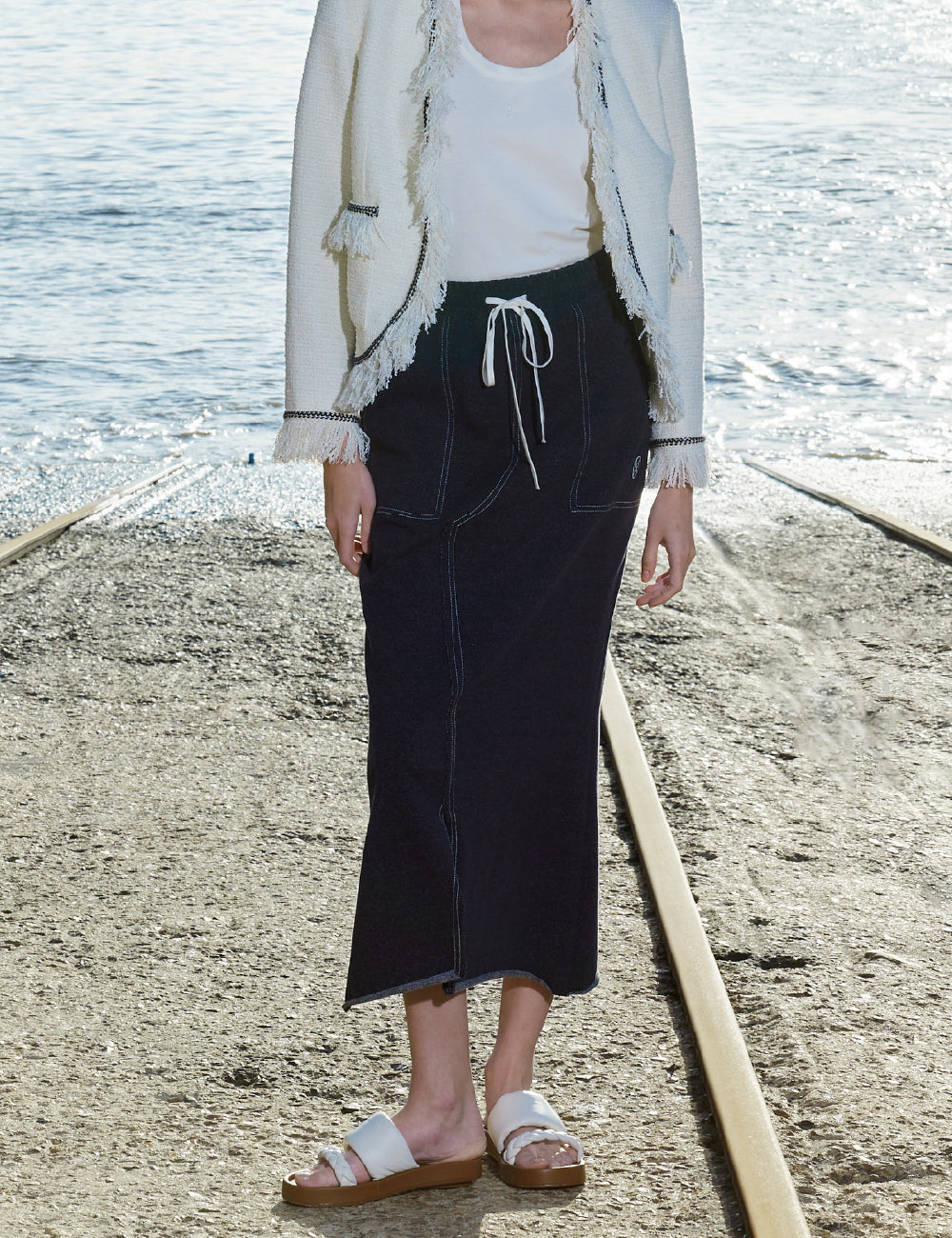 The fabric of this garment is made of a specially-dyed pure cotton knit material that has a denim-style texture and the elasticity and comfort of knitwear. The surface is decorated with contrasting stitching, and the waistband is elastic, allowing for various styling options, such as wearing it high-waisted or low-waisted.