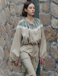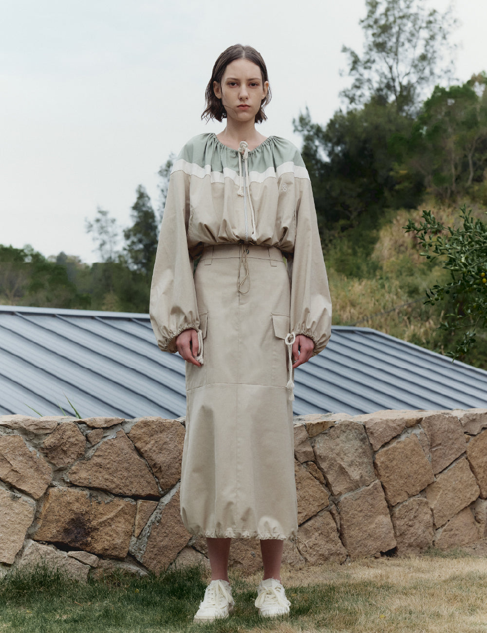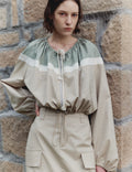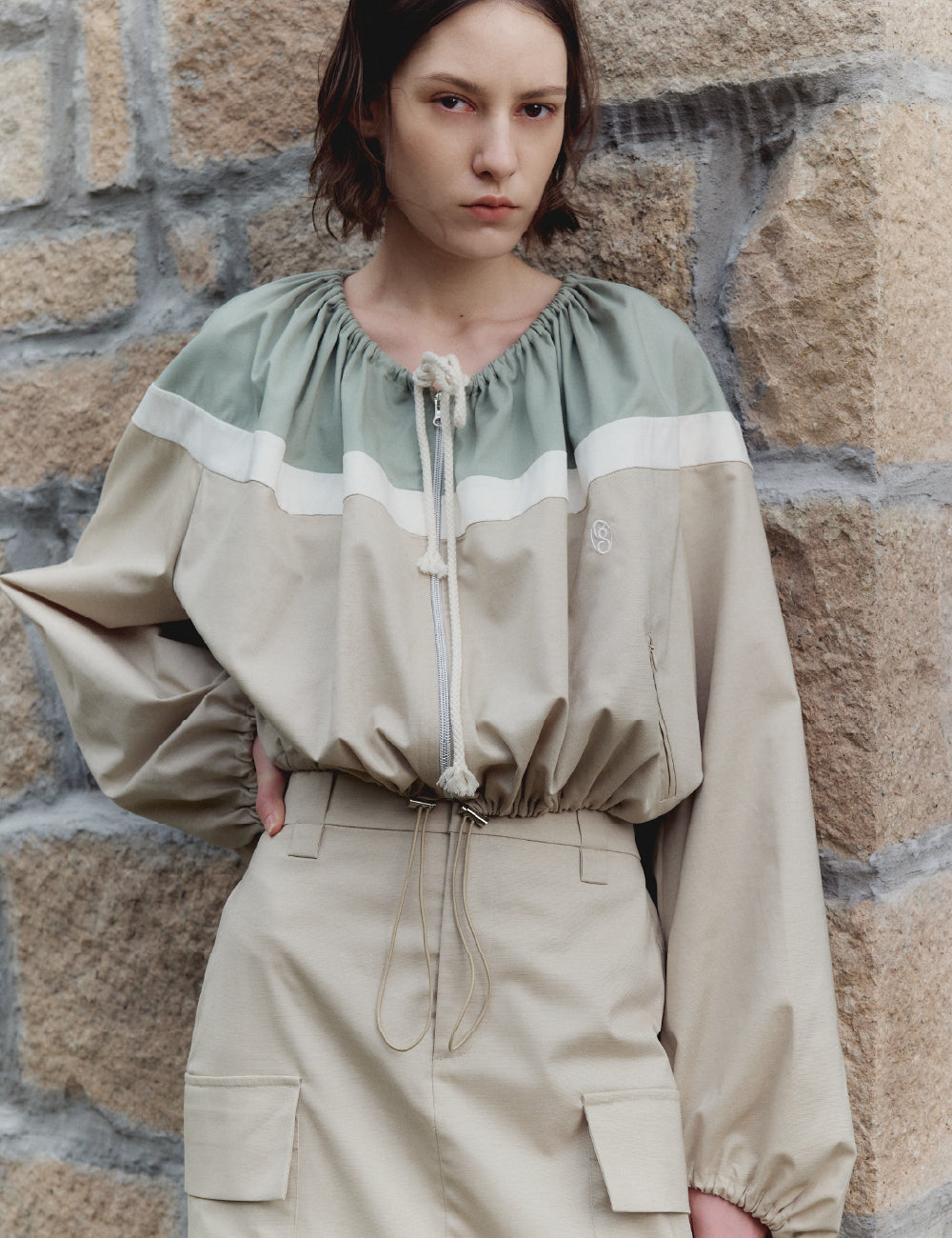 The three-color contrast brings a unique visual effect, while the drawstring design on the collar, sleeves, and hem adds a relaxed and casual touch. The brand embroidery details create a refined and sporty casual look.
