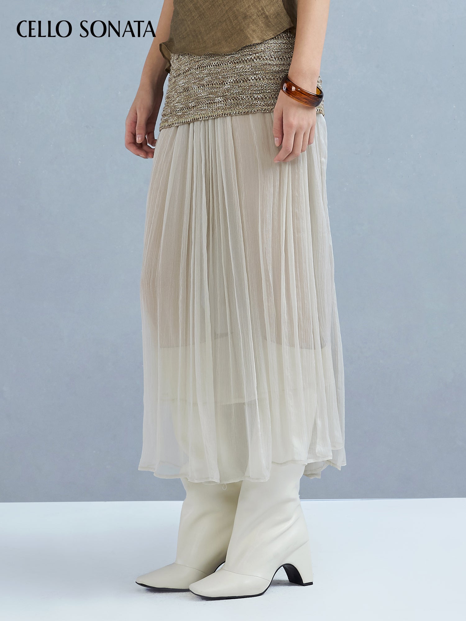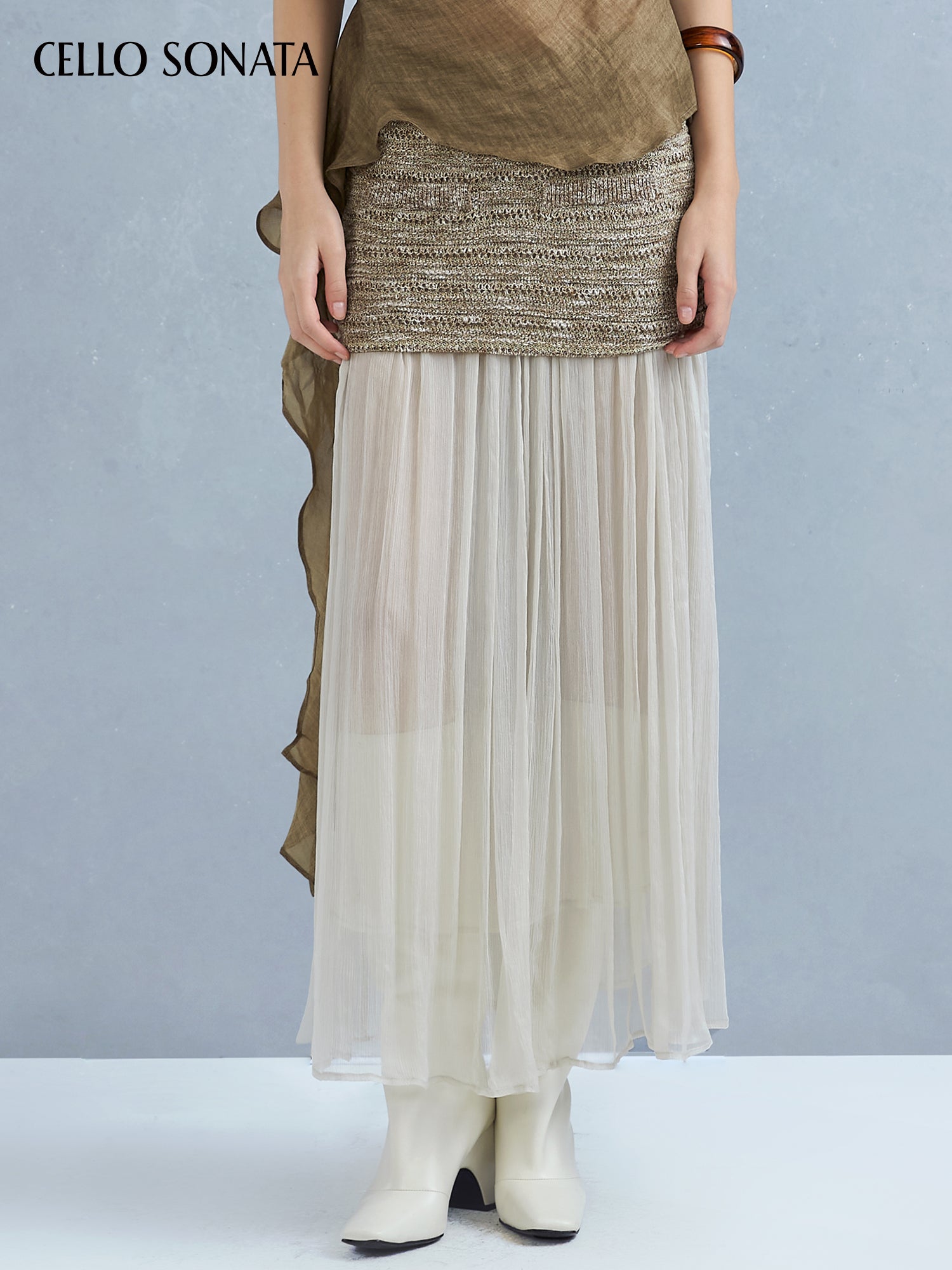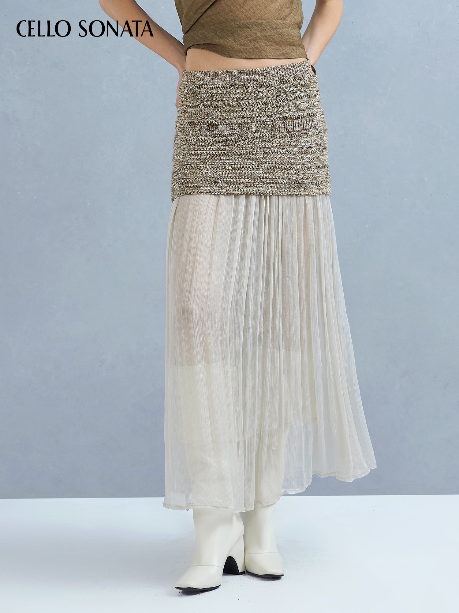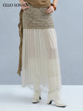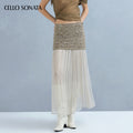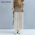 This knitted skirt blends two yarns for rich texture and unique charm. A slim-fitting base is paired with a long tulle hem that elongates and sculpts the legs, creating a slimmer silhouette. The soft, layered yarn detail adds gentle elegance and a dreamy, ethereal touch.