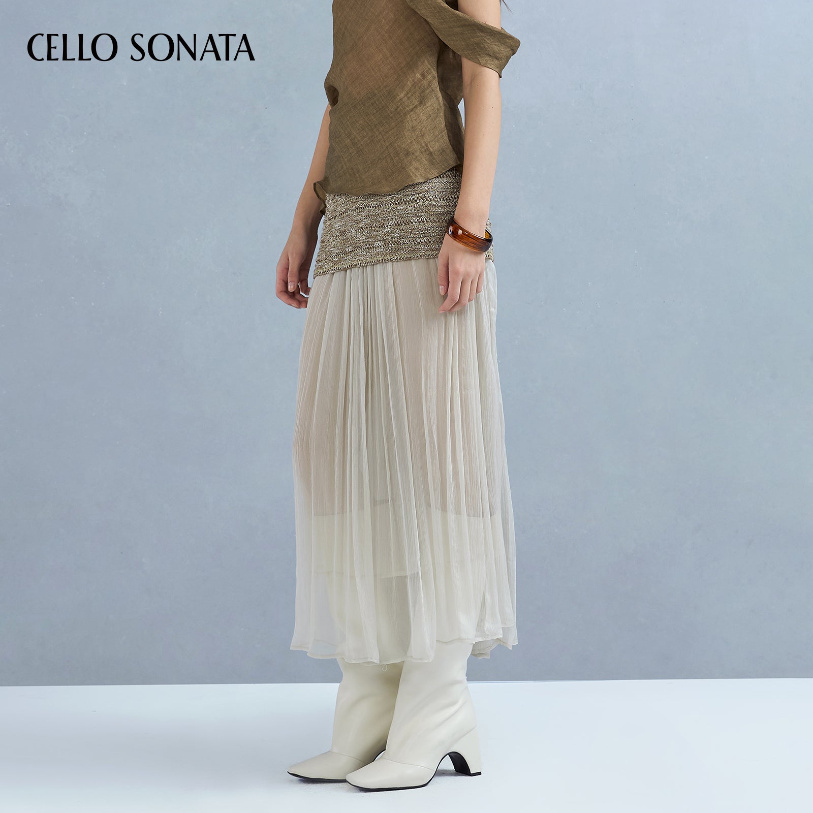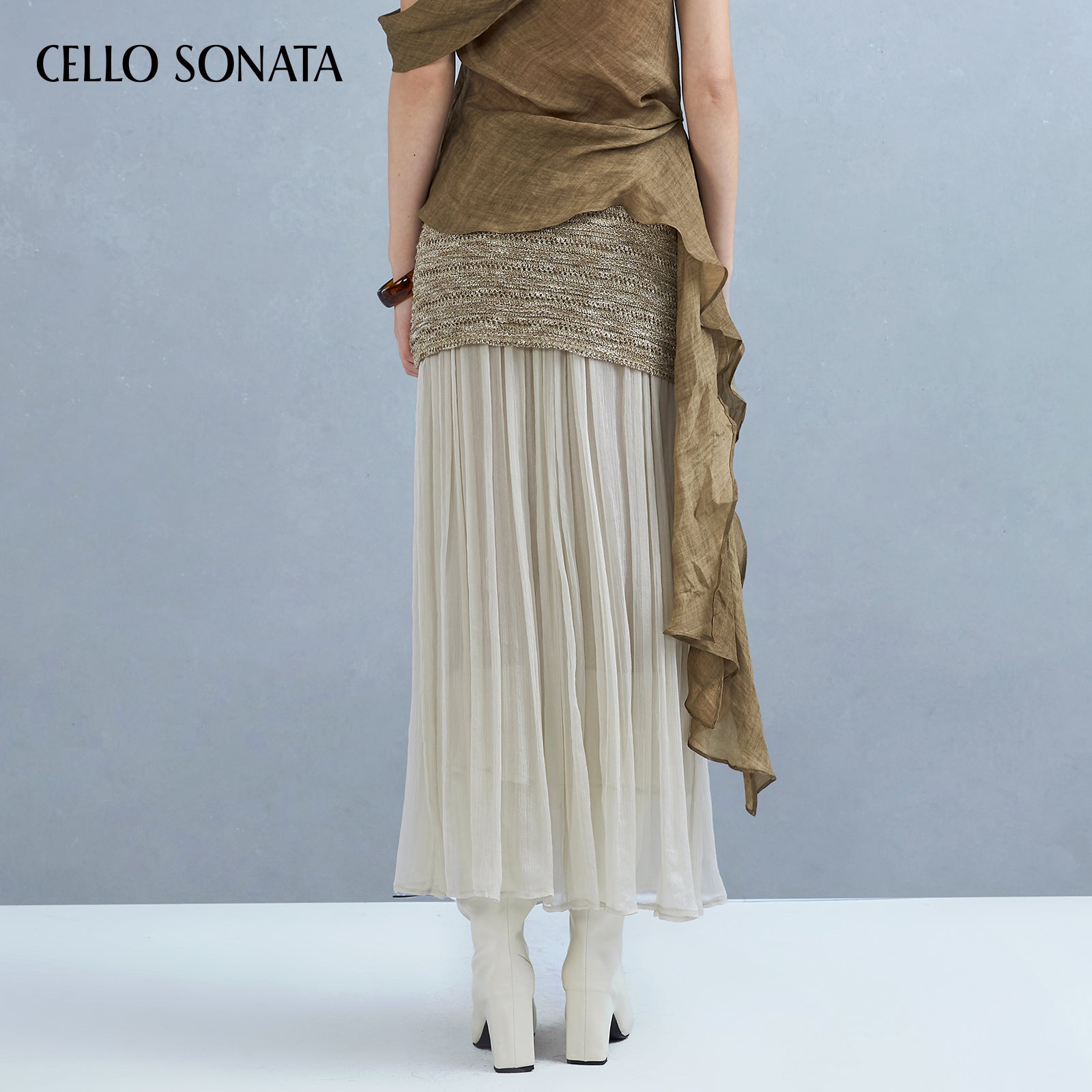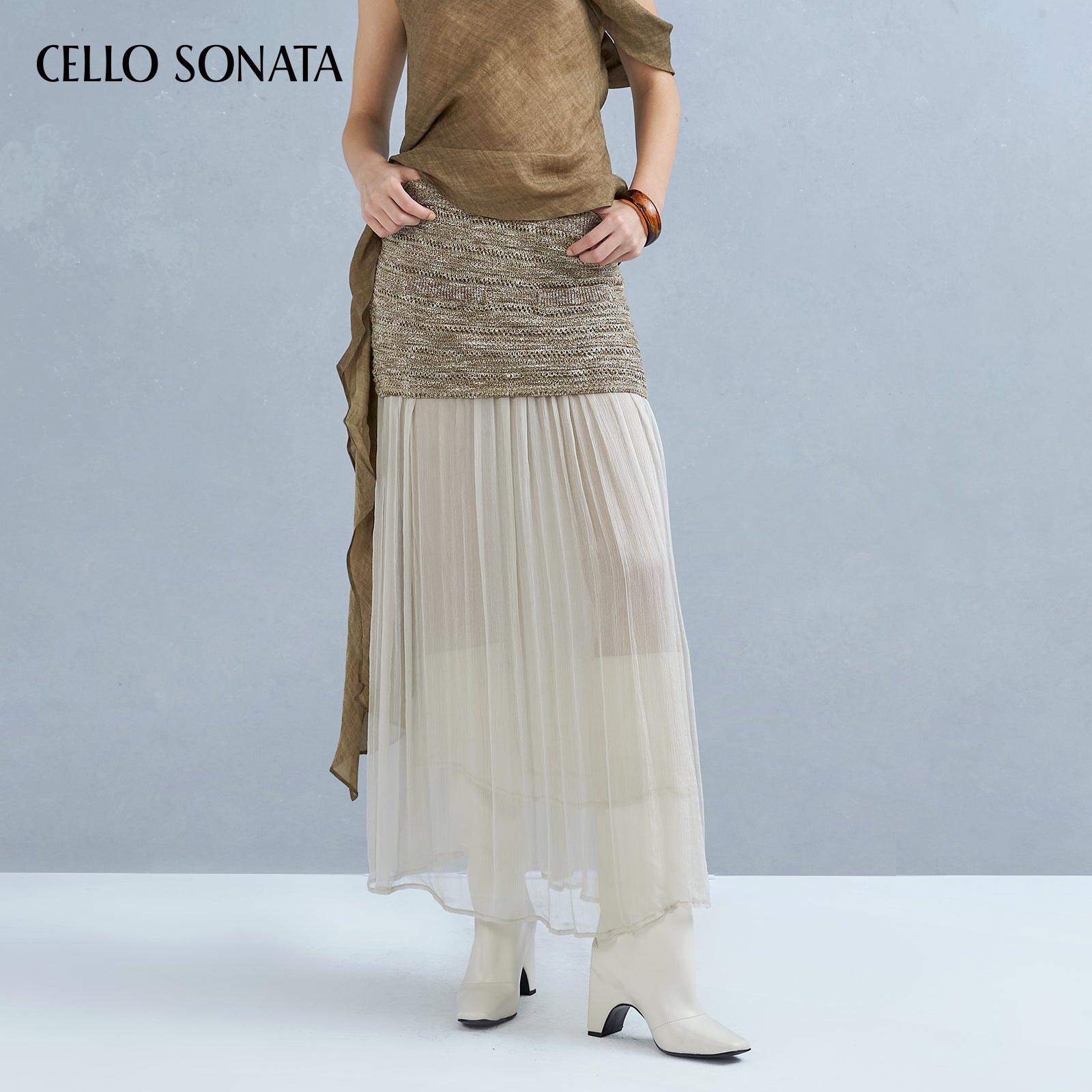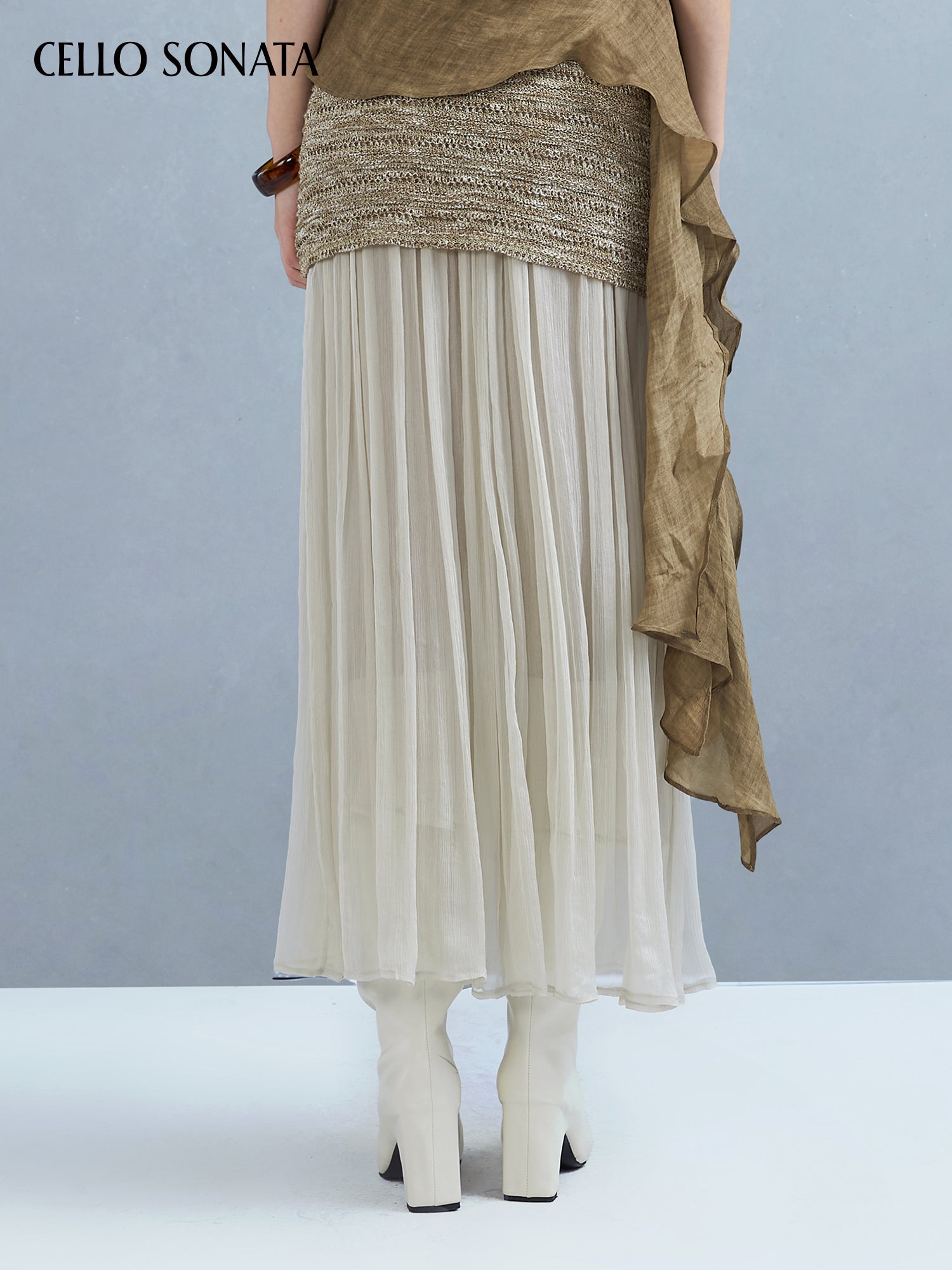 This knitted skirt blends two yarns for rich texture and unique charm. A slim-fitting base is paired with a long tulle hem that elongates and sculpts the legs, creating a slimmer silhouette. The soft, layered yarn detail adds gentle elegance and a dreamy, ethereal touch.