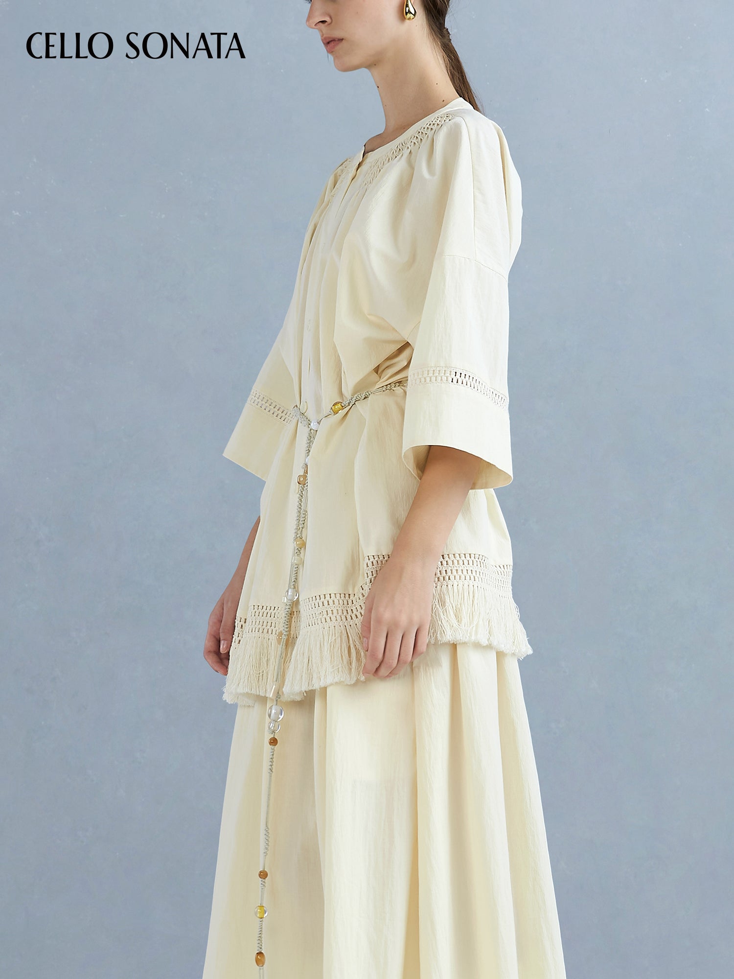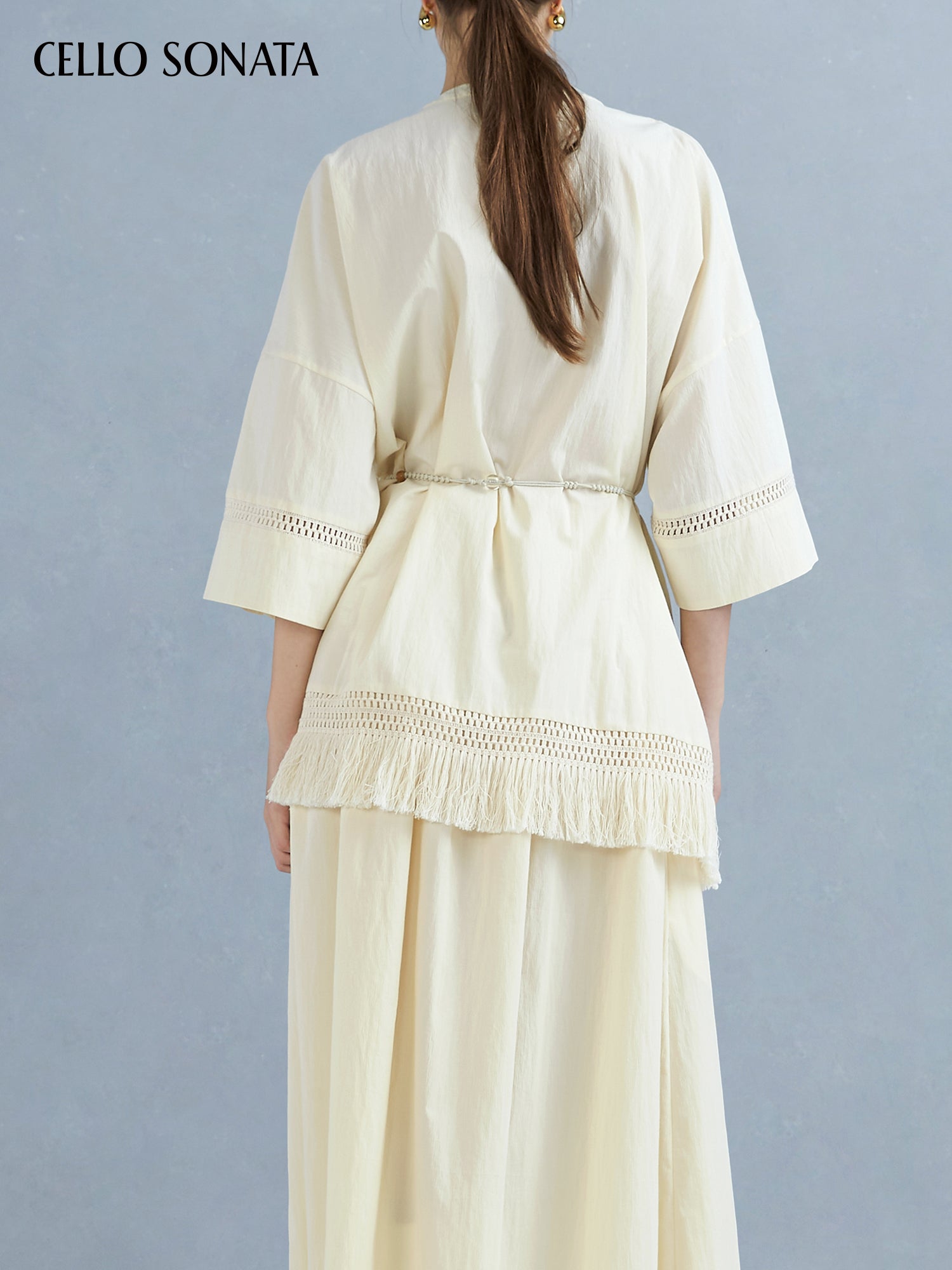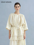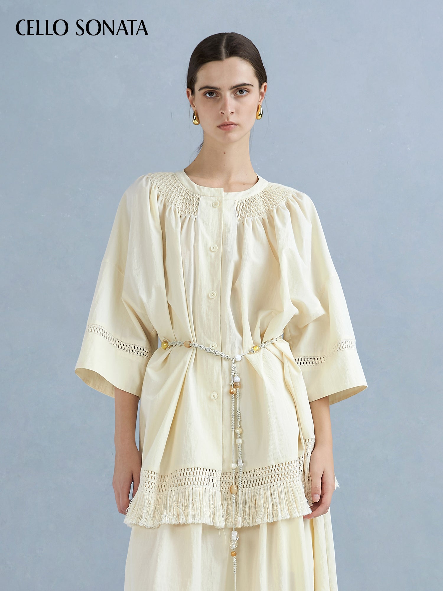 The hand-pleated neckline adds delicate detail, while the relaxed dropped shoulders flatter all shapes. Hollow lace trims at the hem and cuffs infuse a chic, stylish touch.