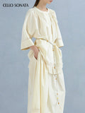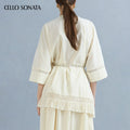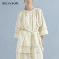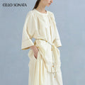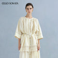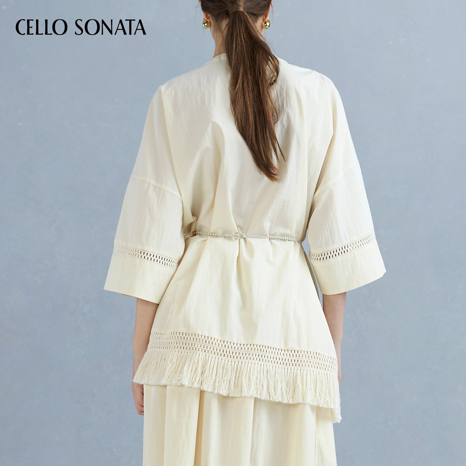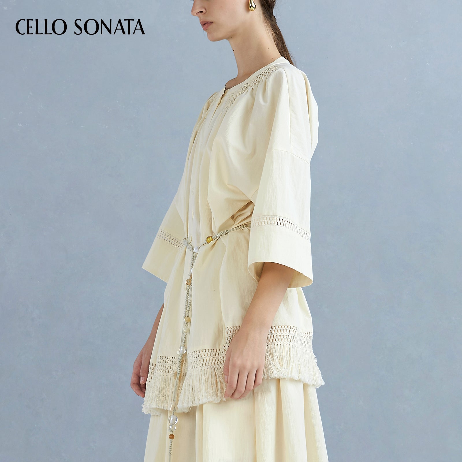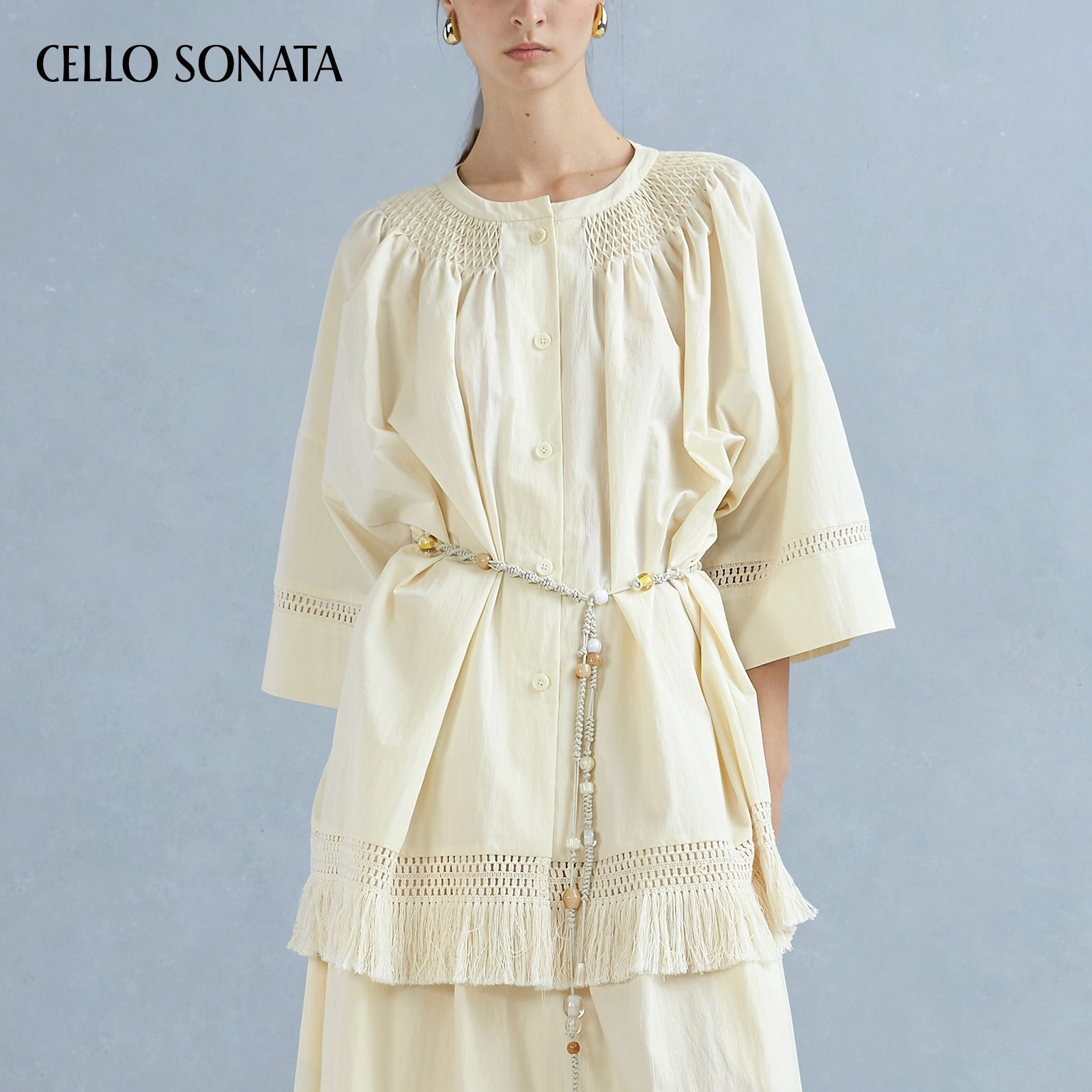 The hand-pleated neckline adds delicate detail, while the relaxed dropped shoulders flatter all shapes. Hollow lace trims at the hem and cuffs infuse a chic, stylish touch.