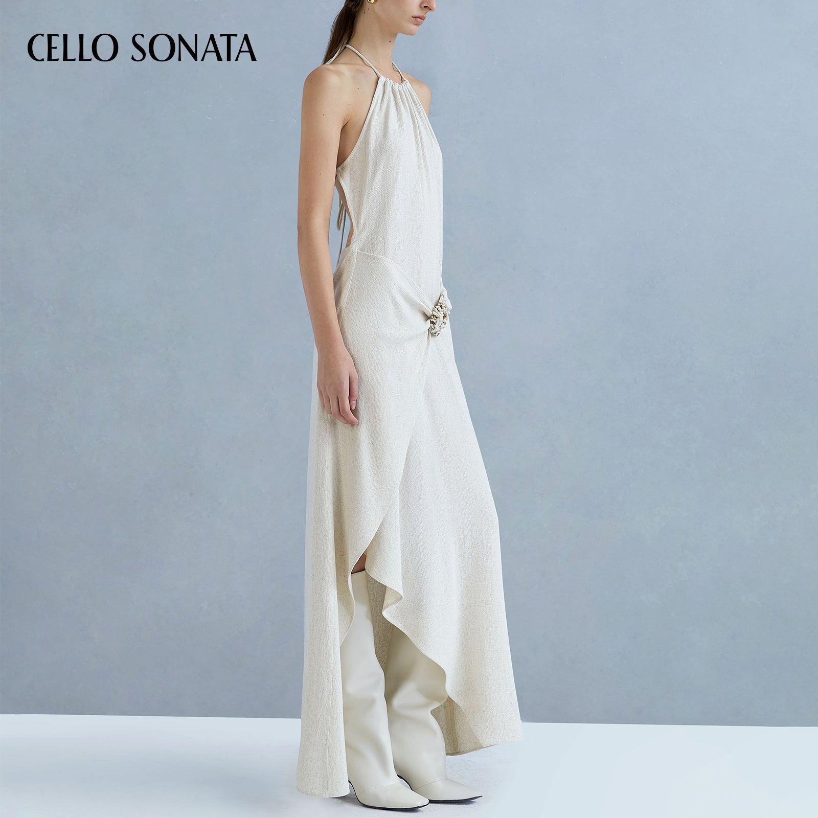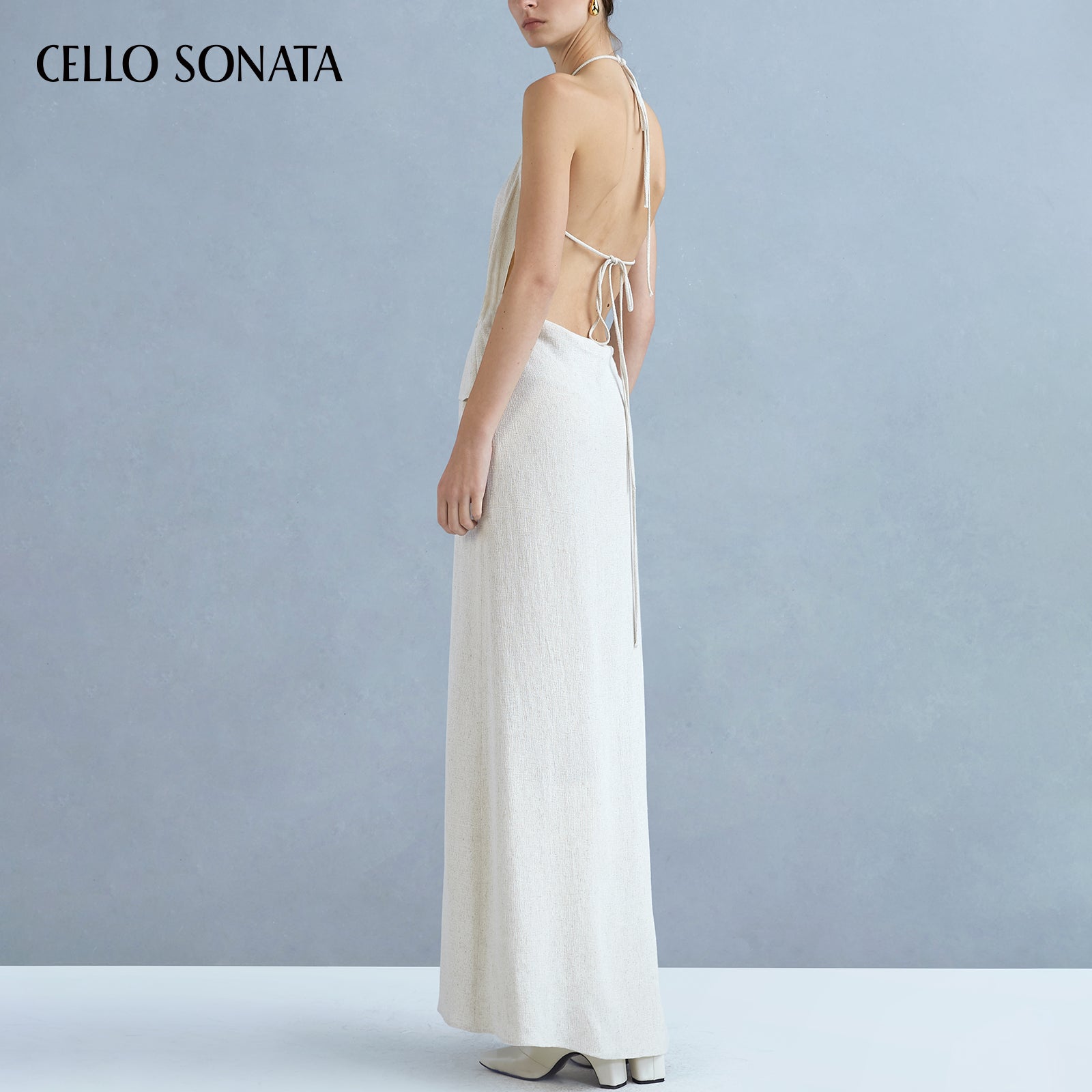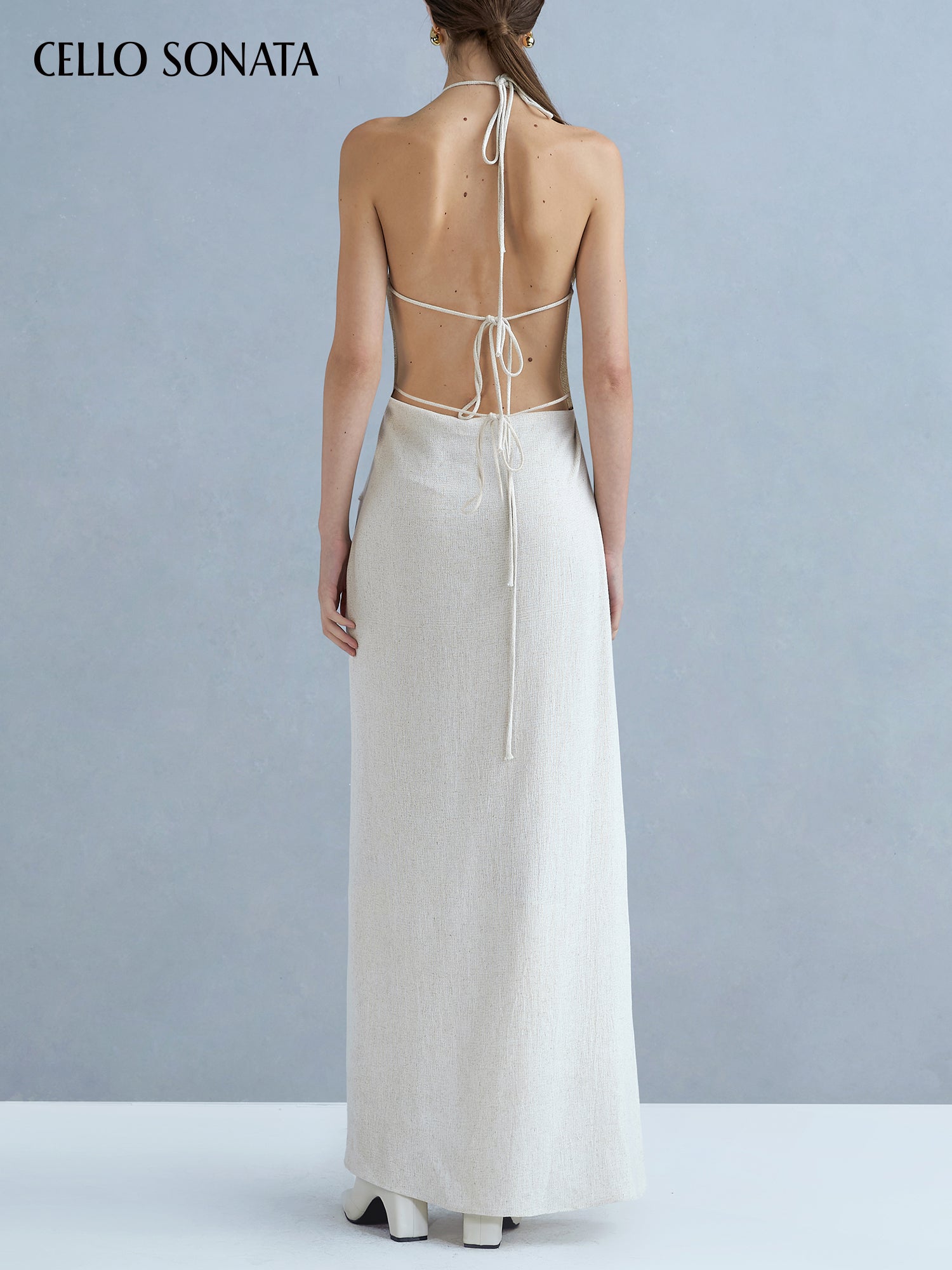 Smooth tailoring with halter neck and waist cut-outs sculpts the silhouette, finished with a flowing hem for graceful motion.
