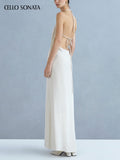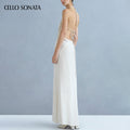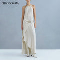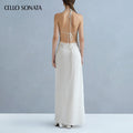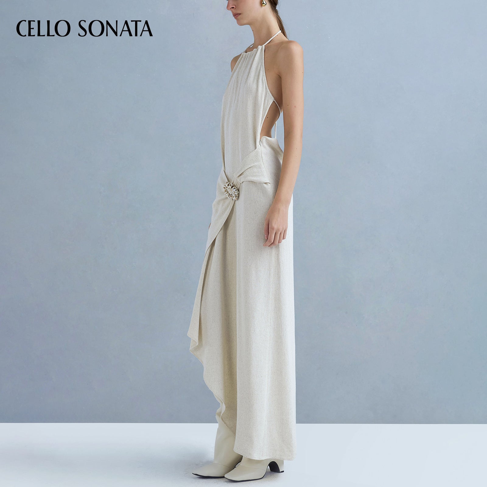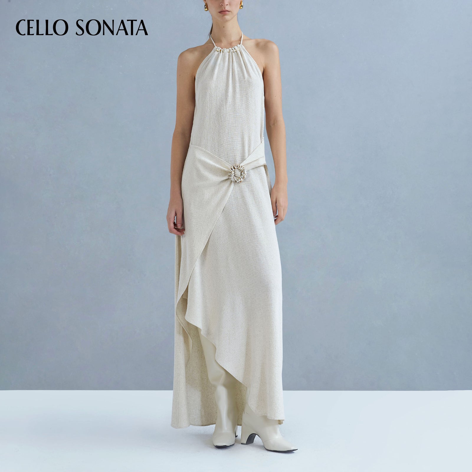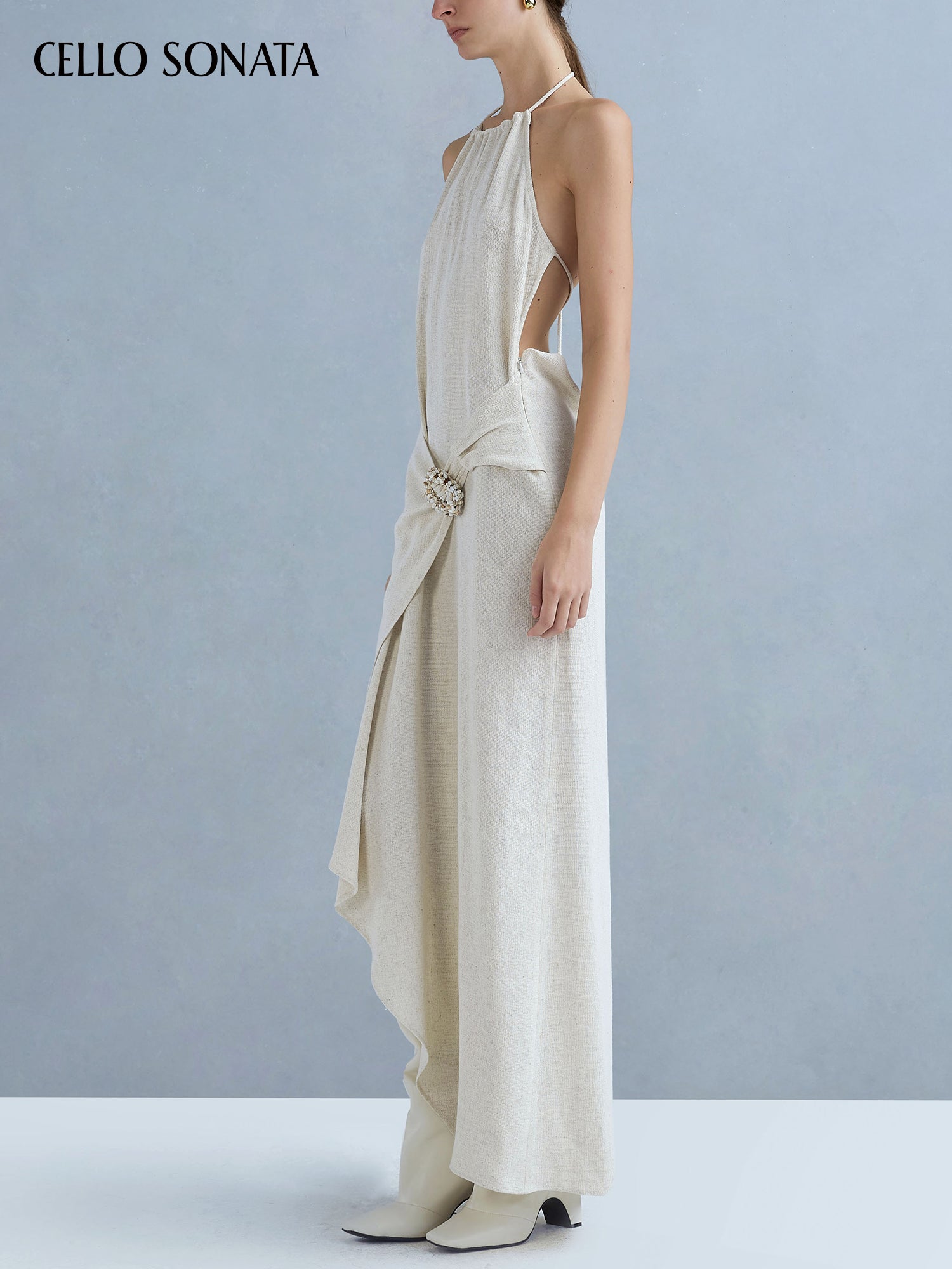 Smooth tailoring with halter neck and waist cut-outs sculpts the silhouette, finished with a flowing hem for graceful motion.