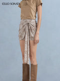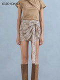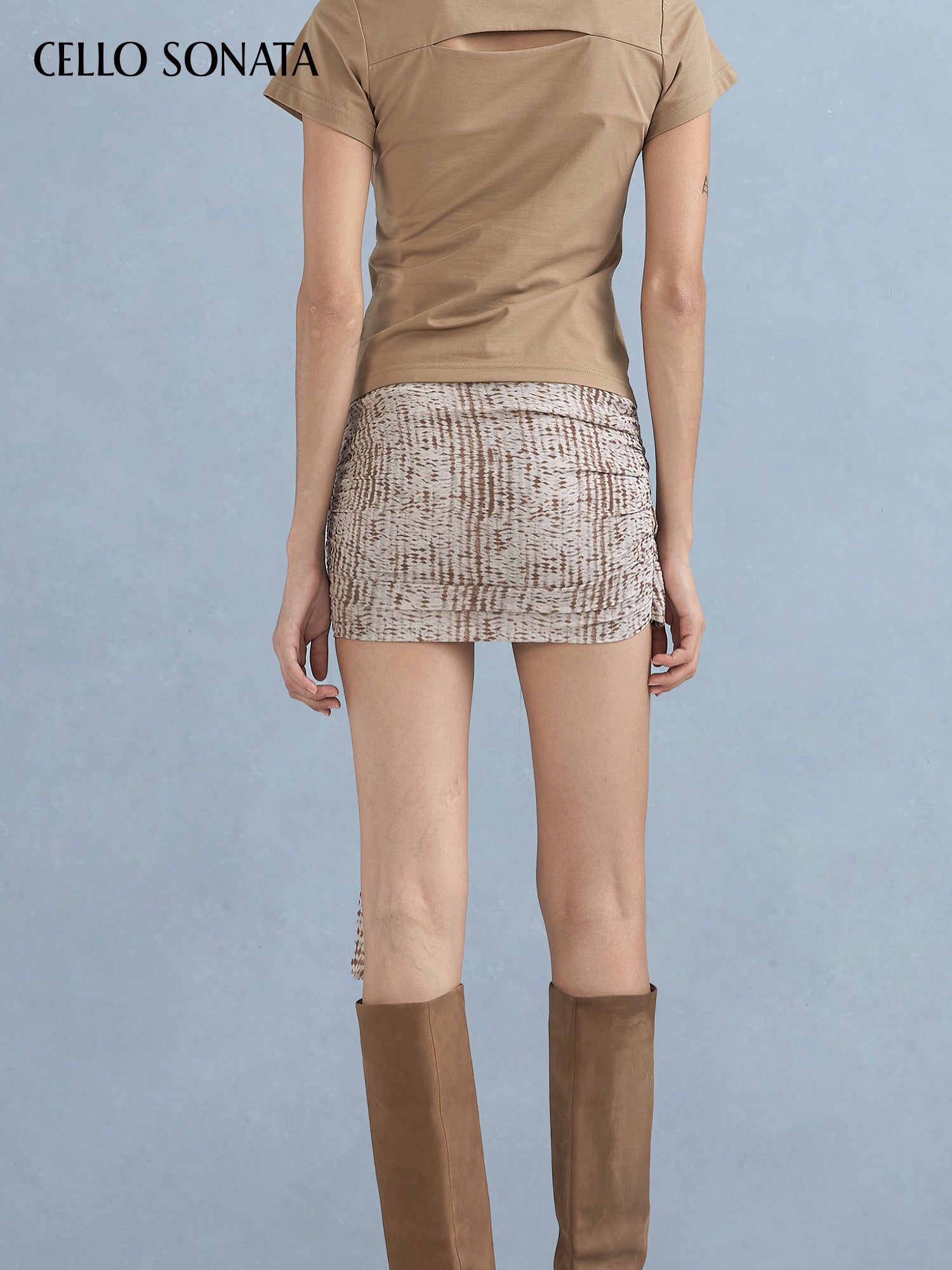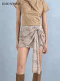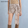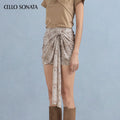 Crafted from unique Moroccan-inspired print fabric, this piece exudes effortless holiday charm. Horizontal pleats flatter the hips, while knotted hanging ribbons add delicate, eye-catching detail.