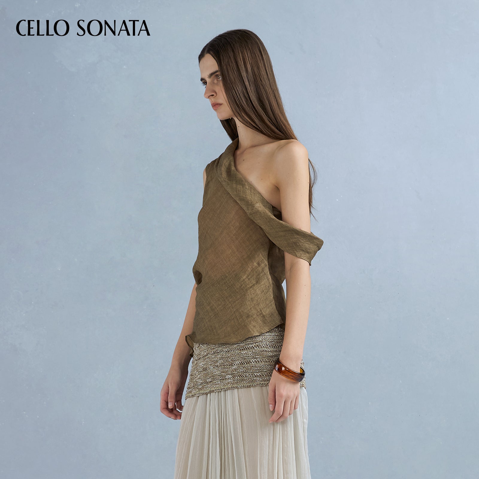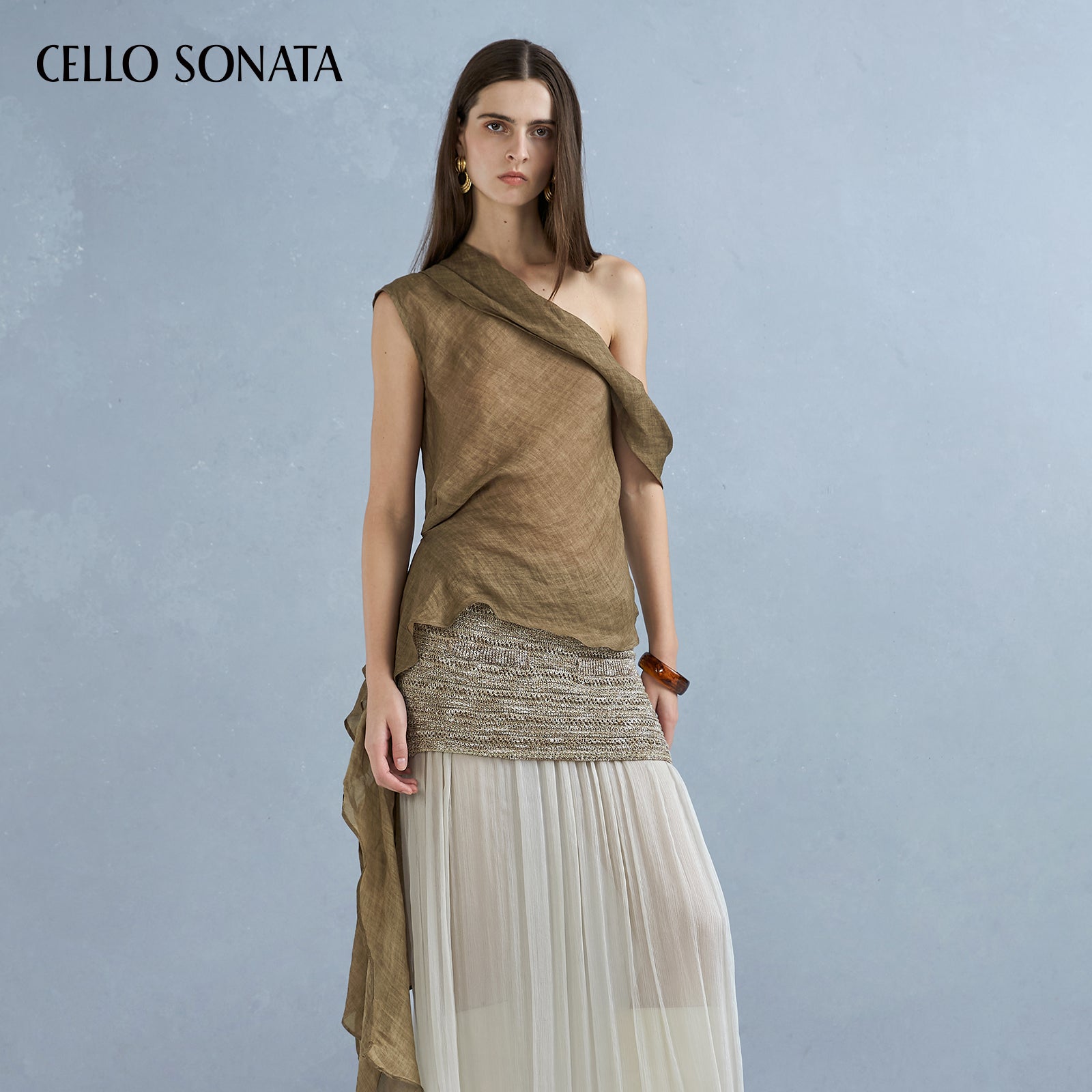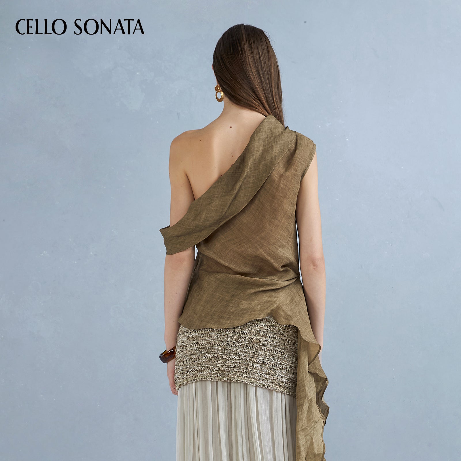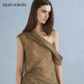 The three-dimensional tailoring style, the oblique shoulder neckline design modifies the neck line, and the single-side pleated design at the waist outlines the waistline. The naturally hanging ribbon is smart and elegant when walking, full of design sense.