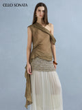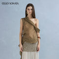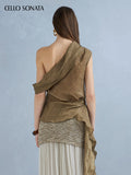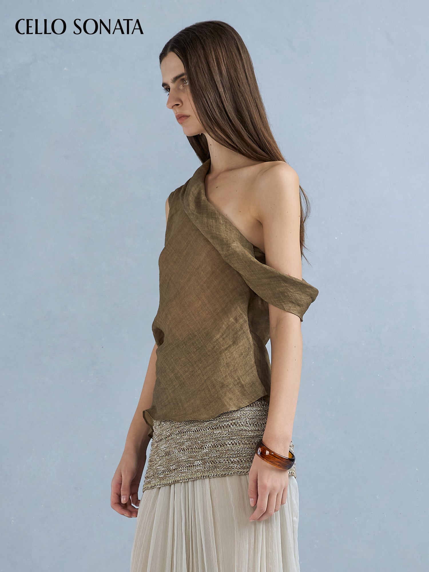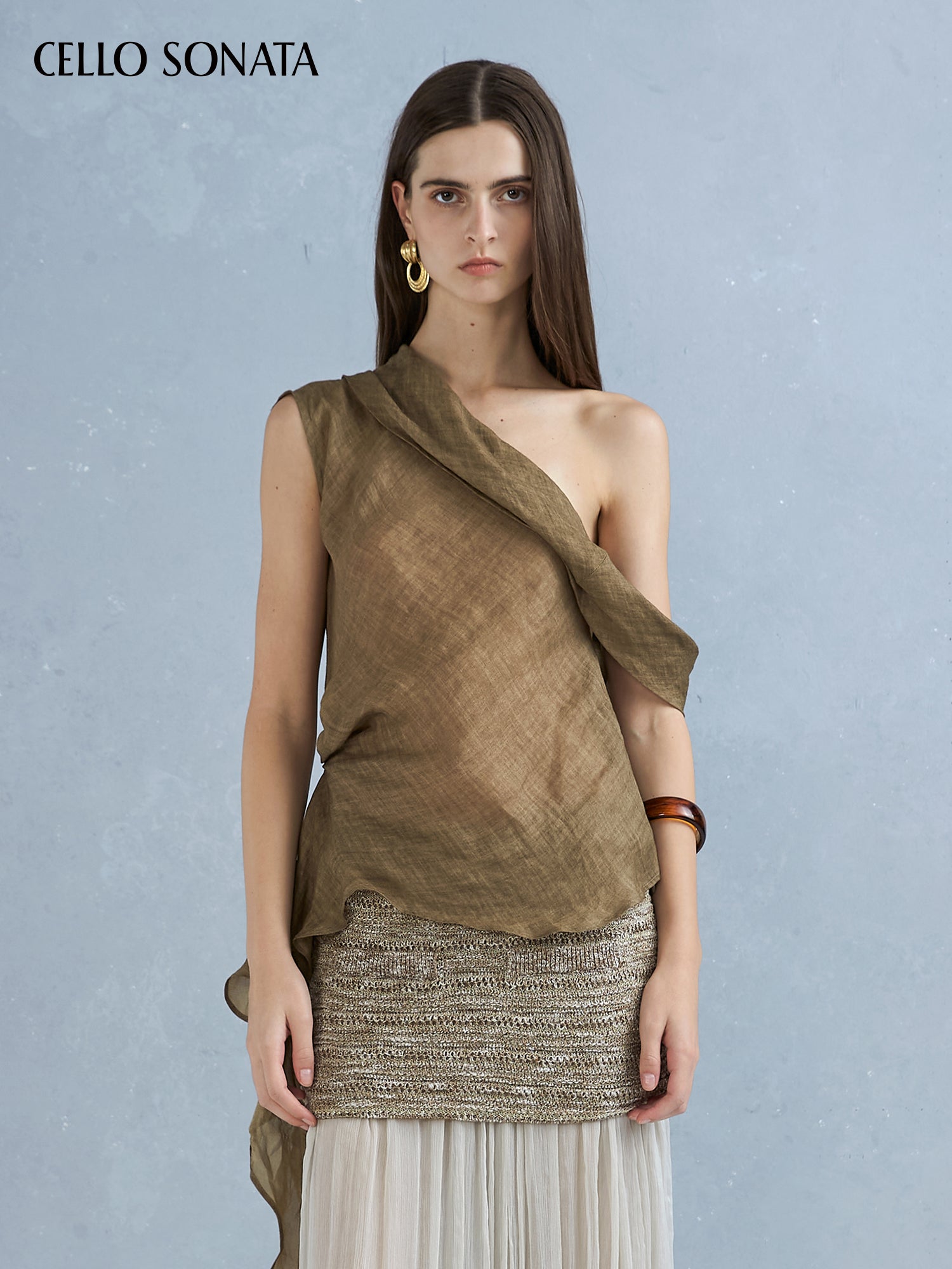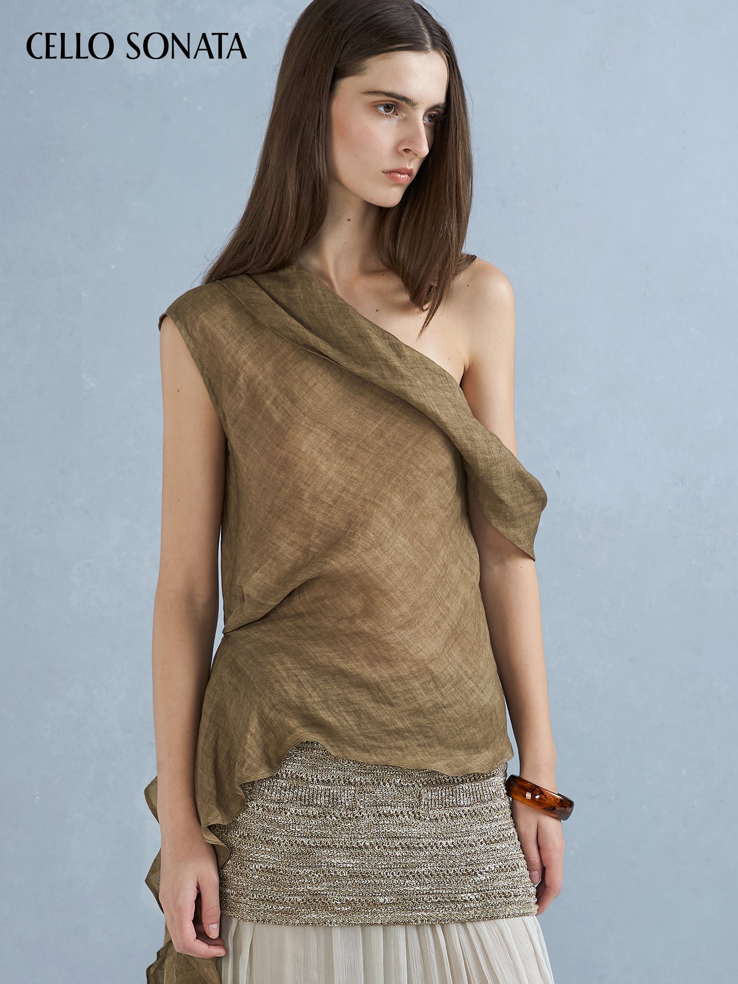 The three-dimensional tailoring style, the oblique shoulder neckline design modifies the neck line, and the single-side pleated design at the waist outlines the waistline. The naturally hanging ribbon is smart and elegant when walking, full of design sense.