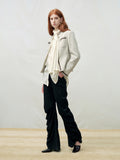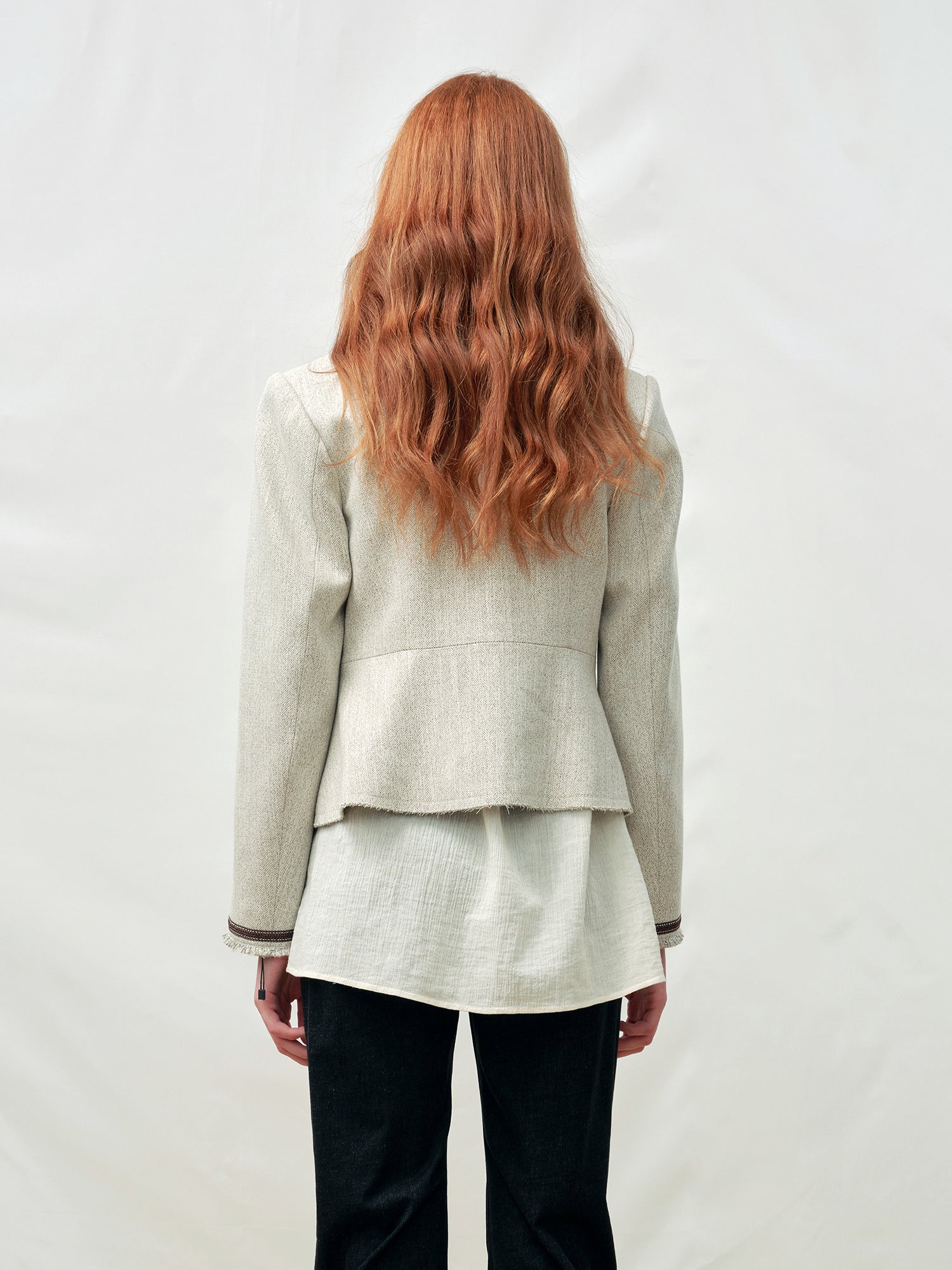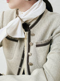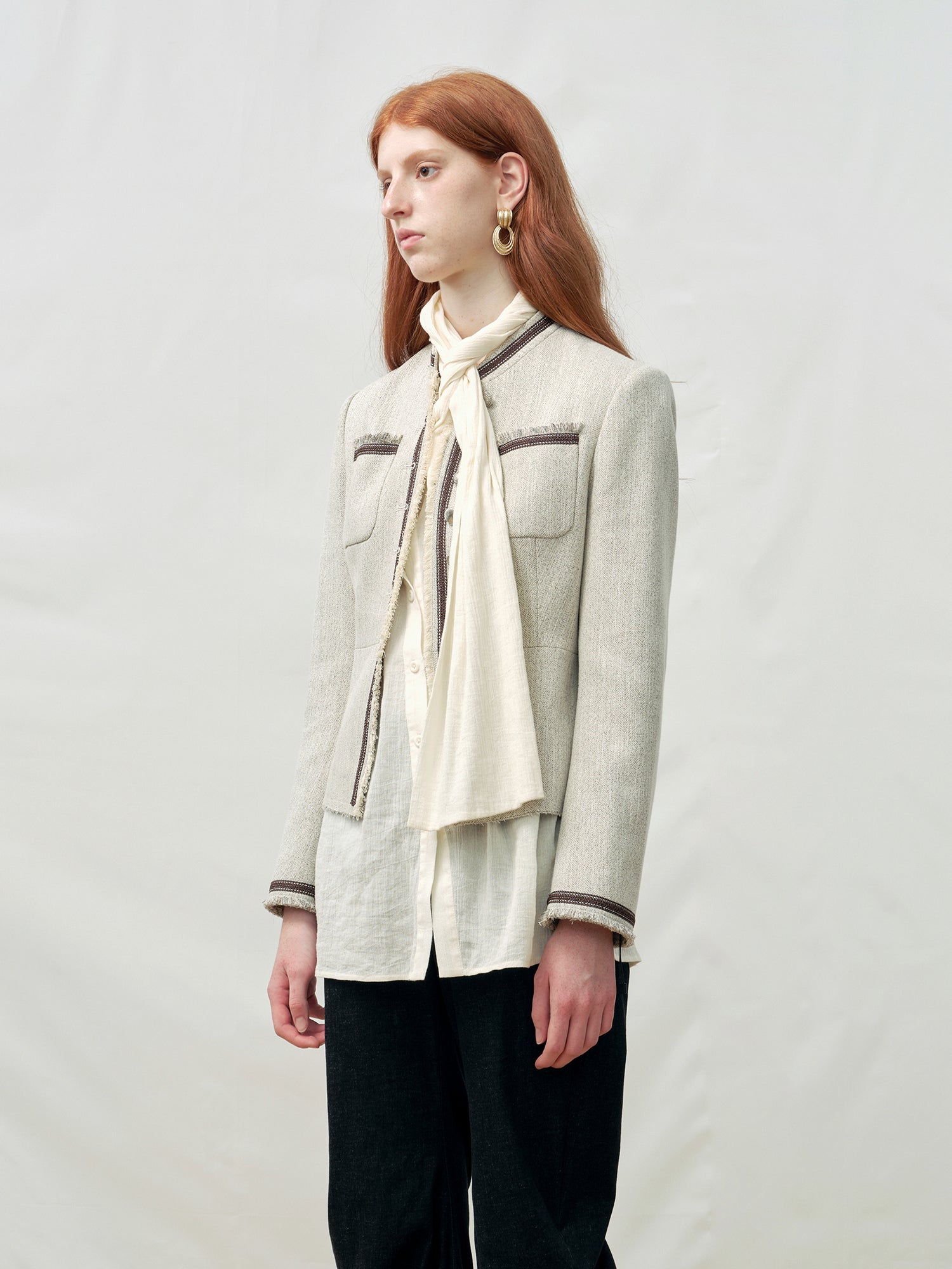 Tassel-Trim Color-Blocked Stand Collar Waist-Cinched Blazer Jacket