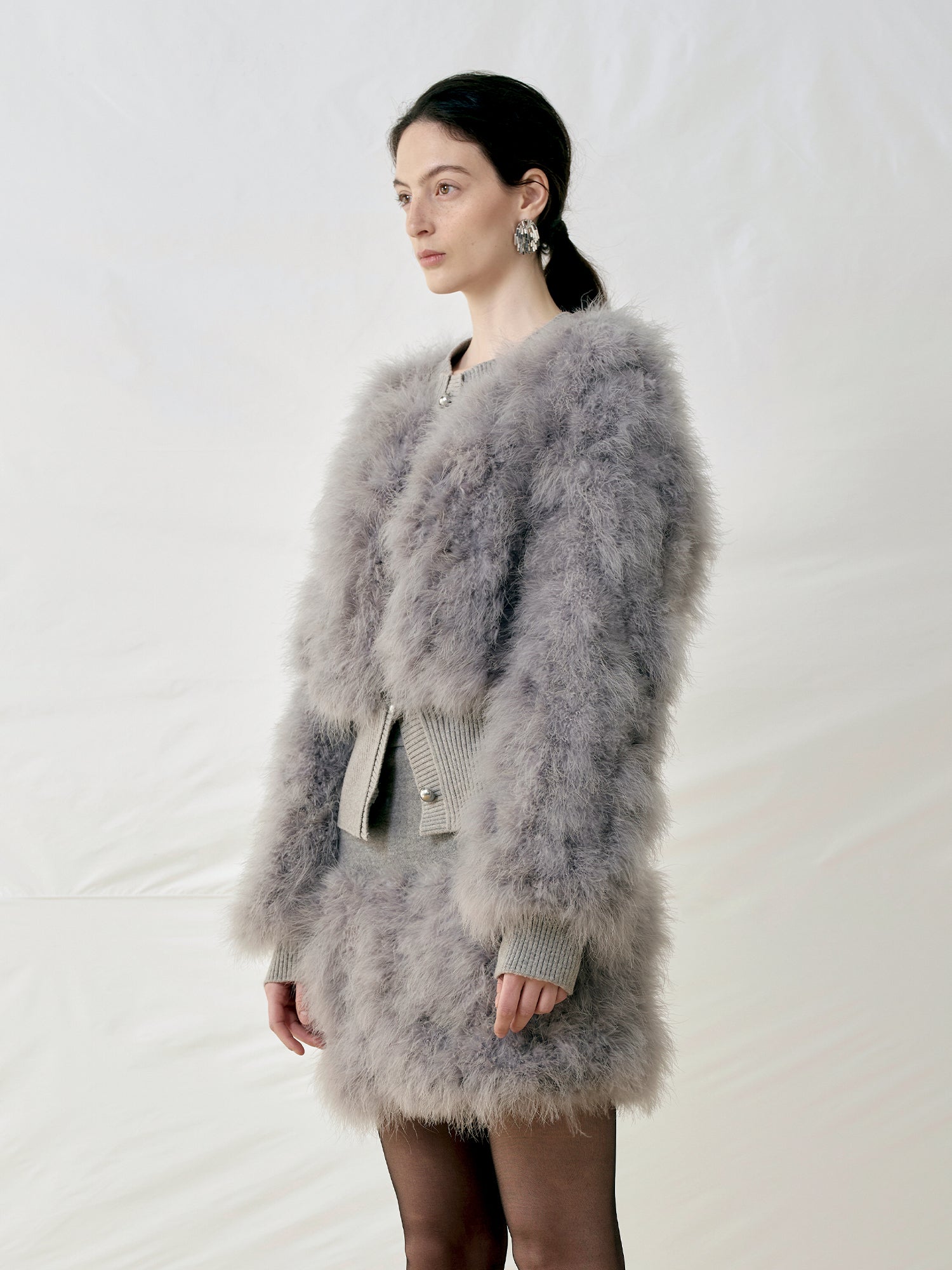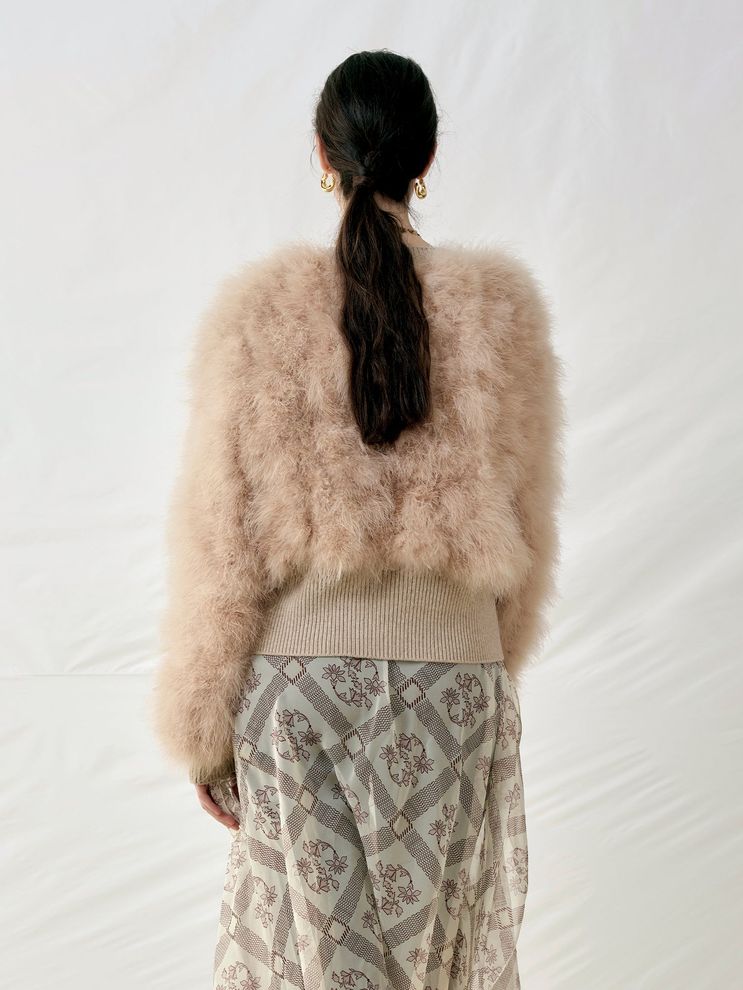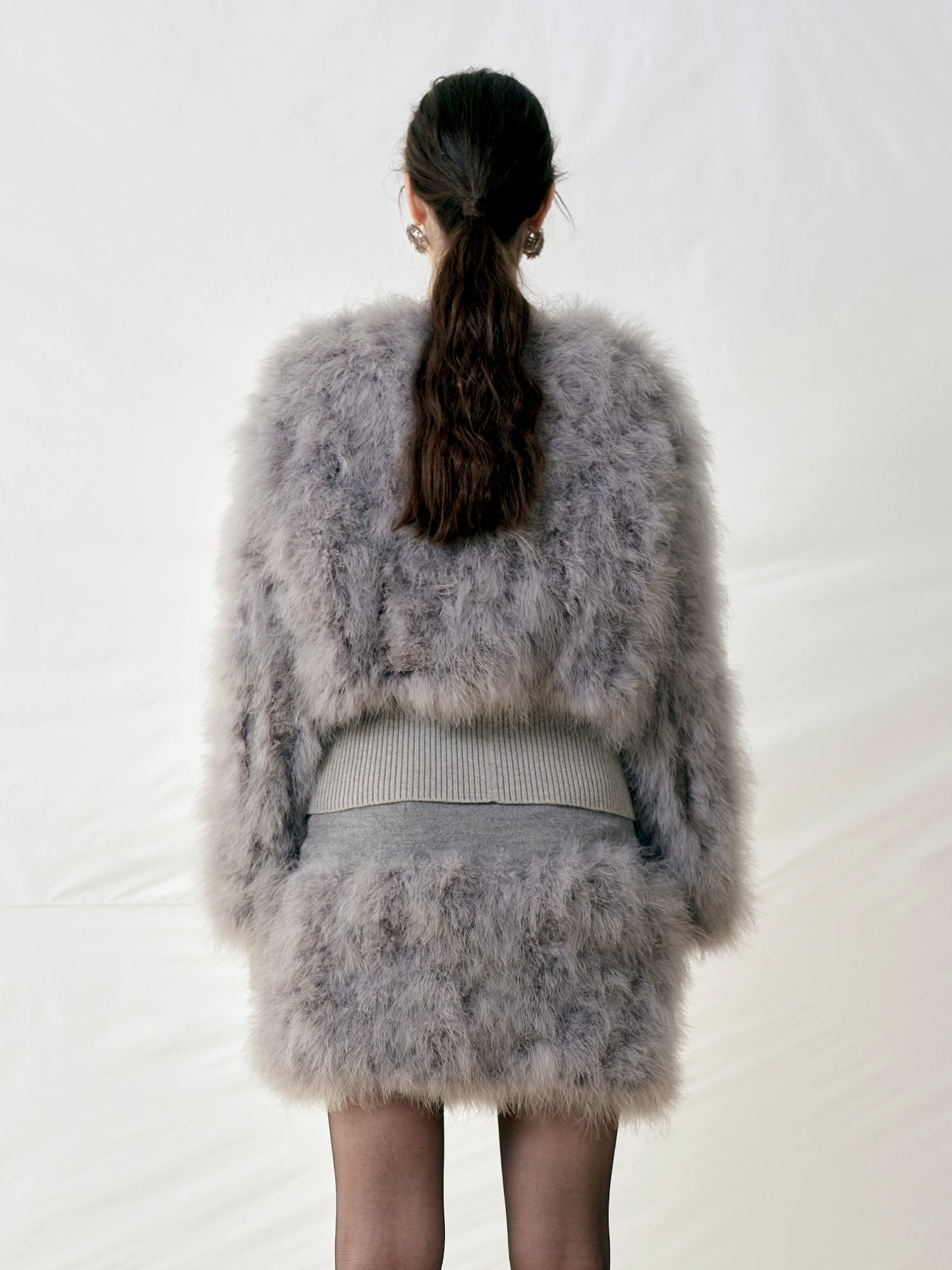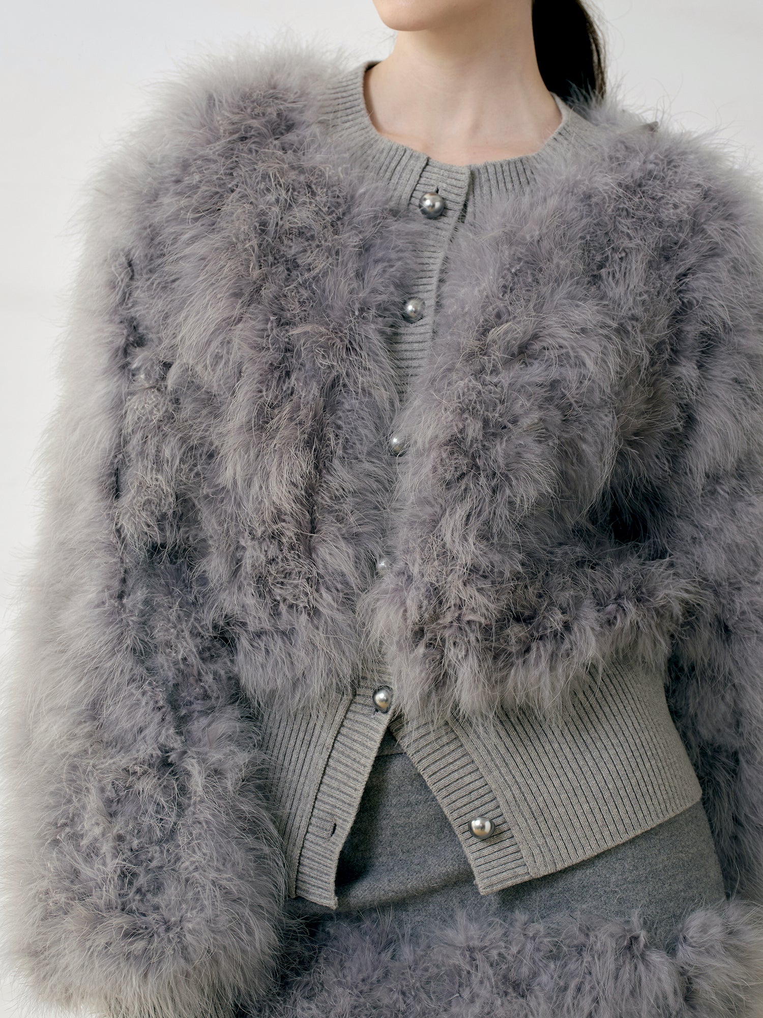 Turkey Feather Patchwork Wool Ribbed Knit Fur Jacket